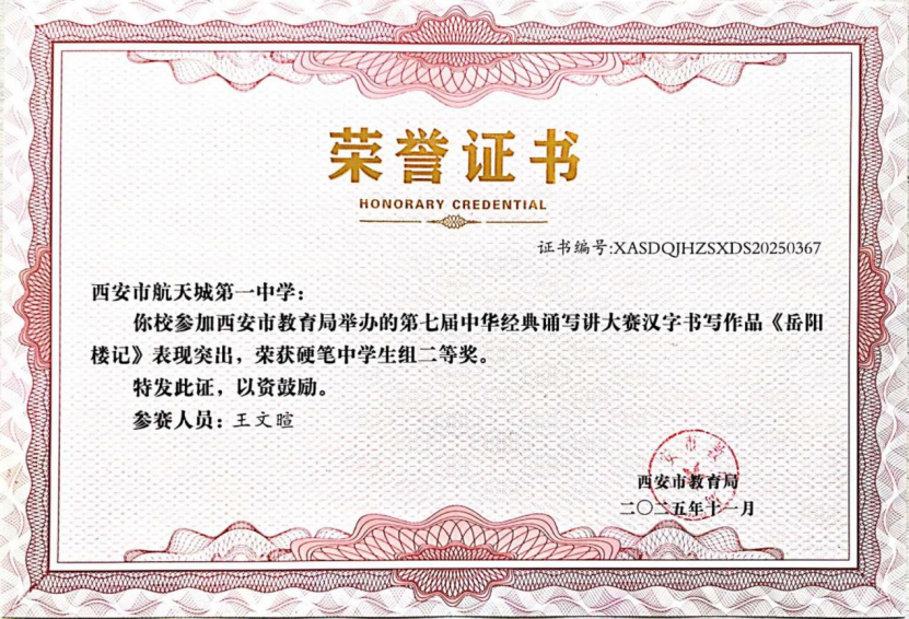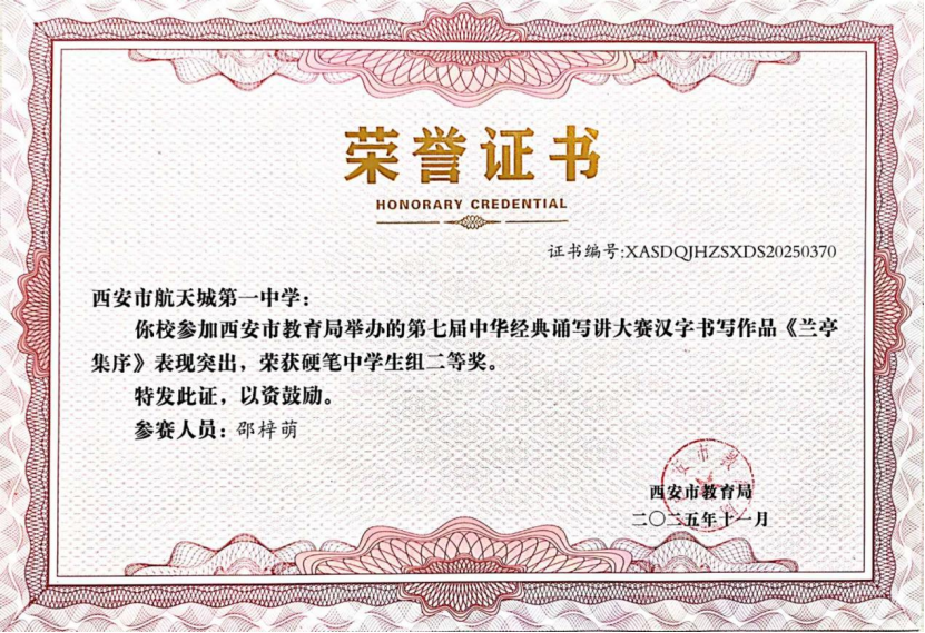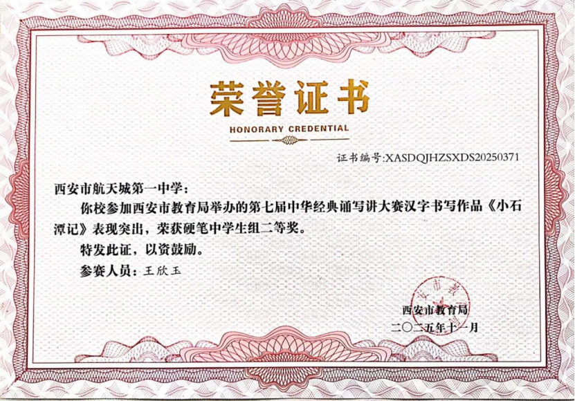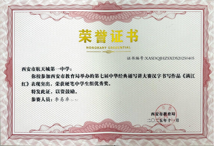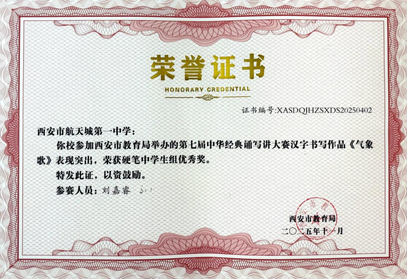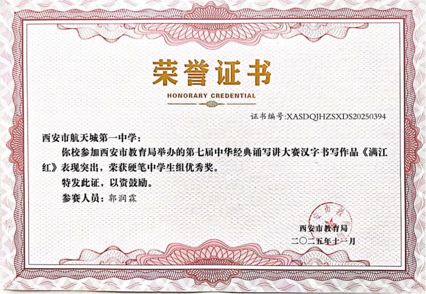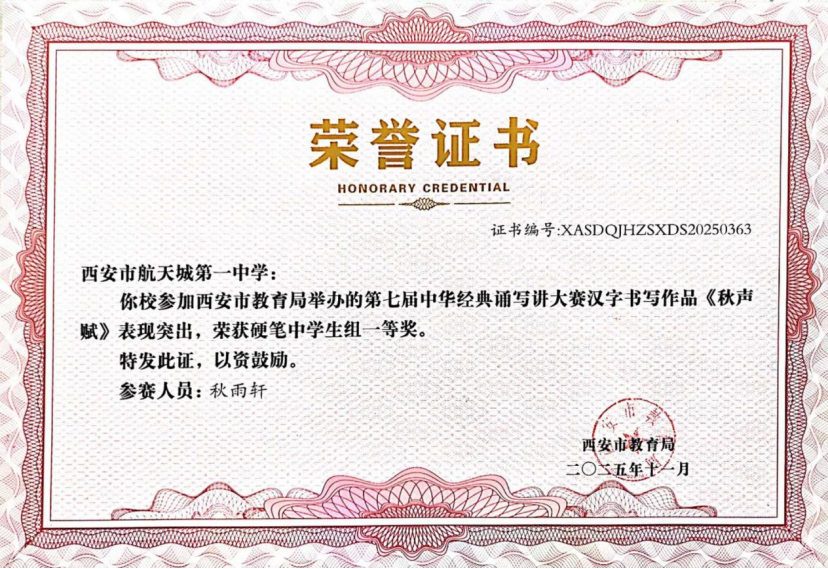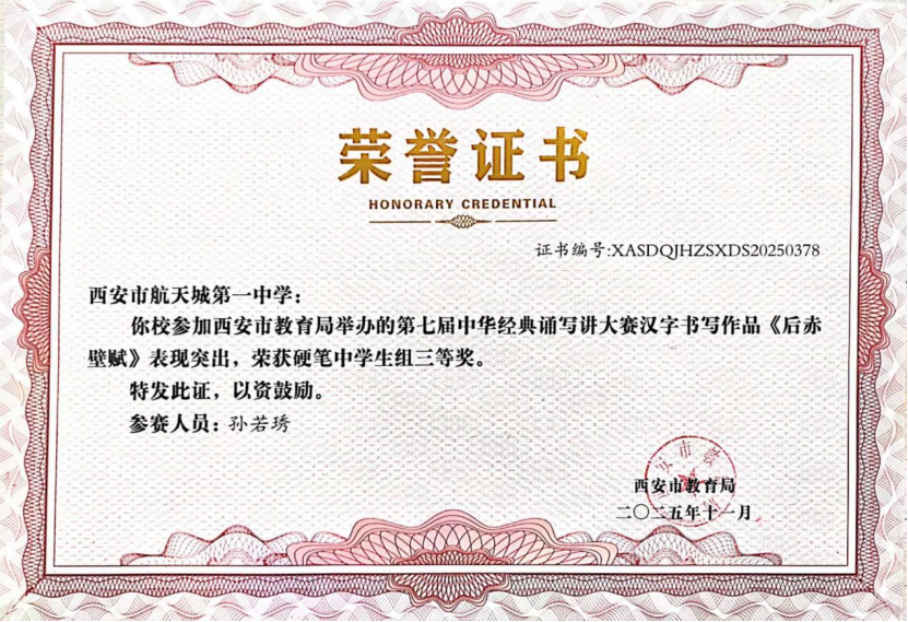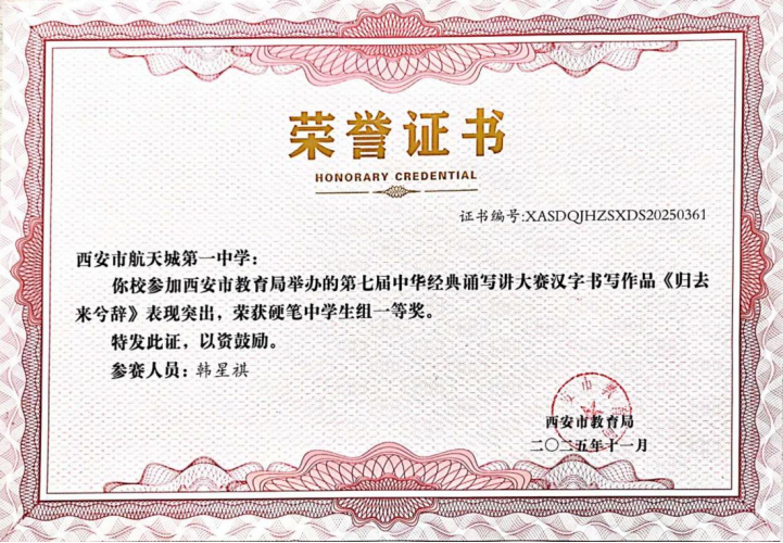 近日,在“第七届中华经典诵写讲大赛‘笔墨中国’汉字书写大赛”全国决赛中,西安市航天城第一中学韩星祺同学脱颖而出,凭借作品《归去来兮辞》荣获中学生组硬笔书法一等奖,成为陕西省中学生组硬笔书法项目唯一获此殊荣的选手!