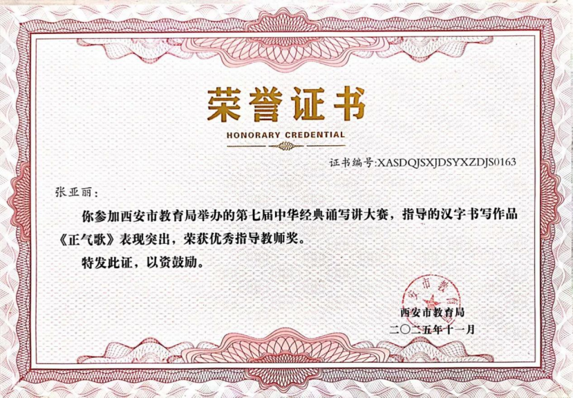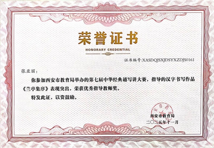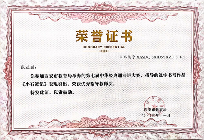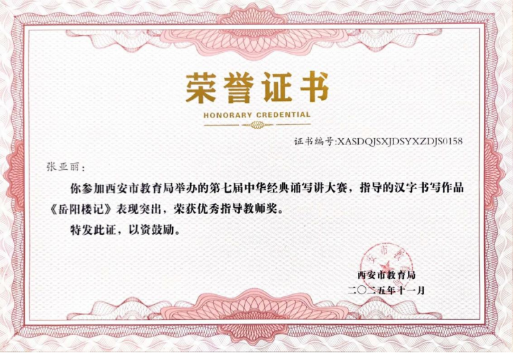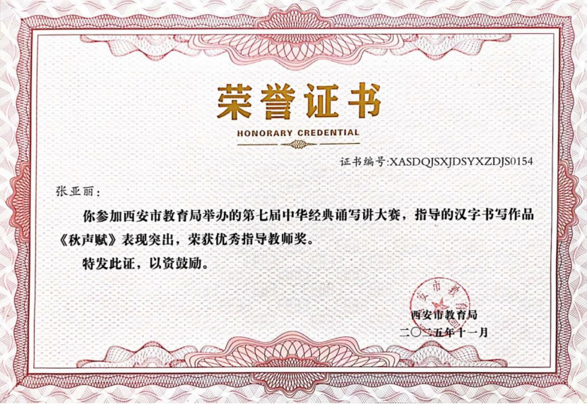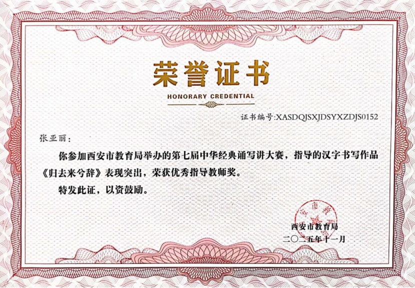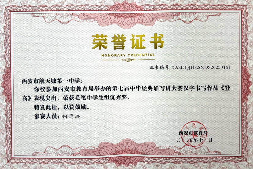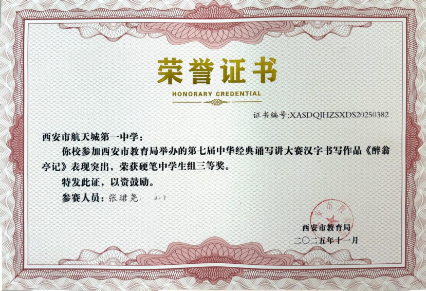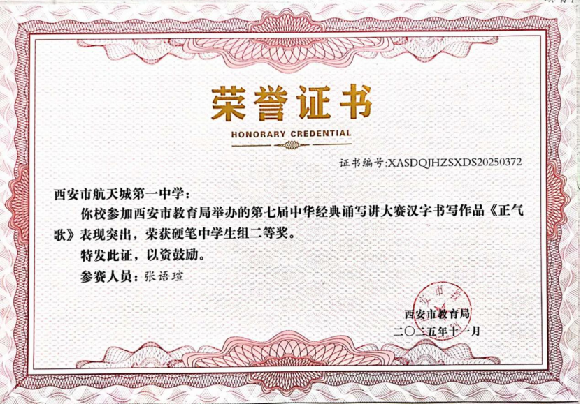 近日,在“第七届中华经典诵写讲大赛‘笔墨中国’汉字书写大赛”全国决赛中,西安市航天城第一中学韩星祺同学脱颖而出,凭借作品《归去来兮辞》荣获中学生组硬笔书法一等奖,成为陕西省中学生组硬笔书法项目唯一获此殊荣的选手!