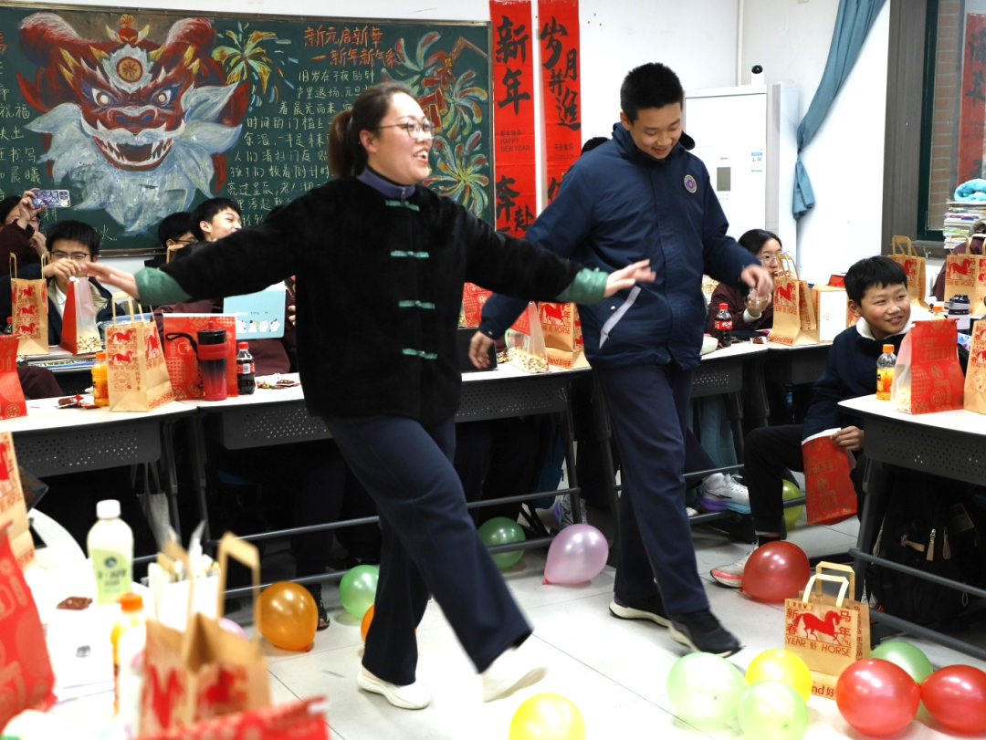 各班还特别设置了互动环节,包括“猜灯谜”“抢椅子”“你画我猜”等趣味游戏。师生们积极参与,现场气氛热烈非凡。特别的互动增强了师生之间的情感交流,也让联欢会更加温馨有趣。