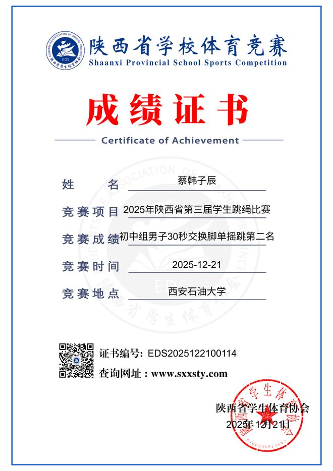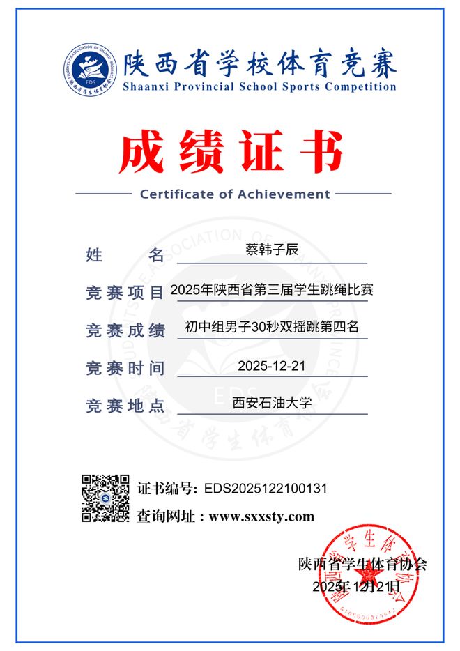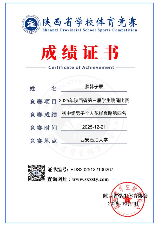 近日,在由陕西省教育厅、陕西省学生体协主办的2025年陕西省学生跳绳比赛中,航天一中七年级蔡韩子辰同学斩获佳绩,勇夺30秒单摇跳亚军、30秒双摇跳第四名、个人花样第四名。
