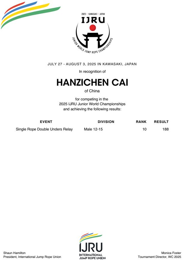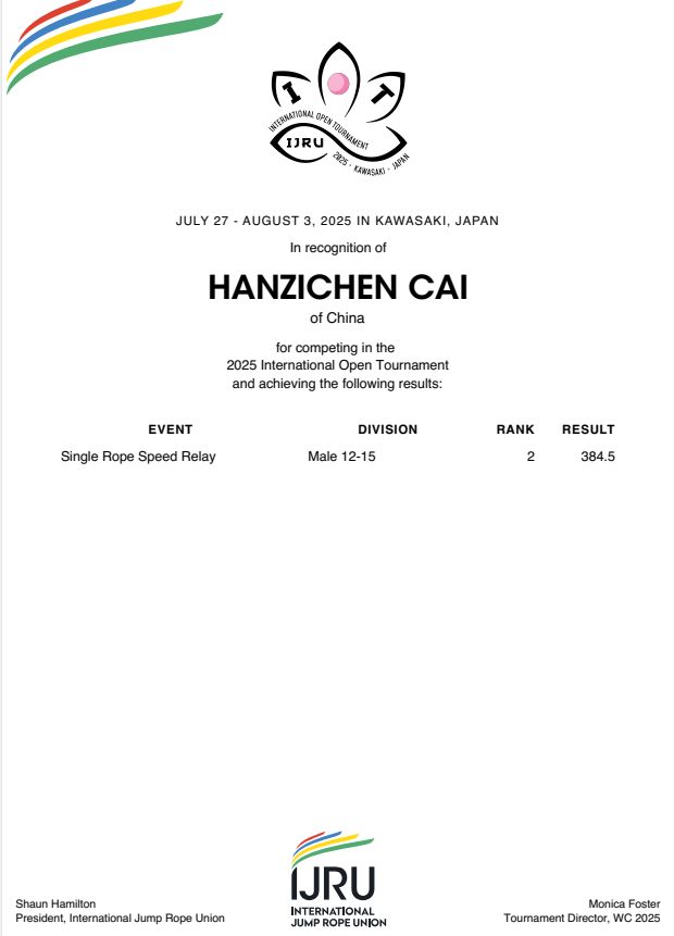 在不久前结束的2025世界跳绳锦标赛上,蔡韩子辰出色发挥,勇夺12-15岁组男子4 ✖️30秒单摇接力第二名,男子12-15岁组2*30秒双摇接力第十名。