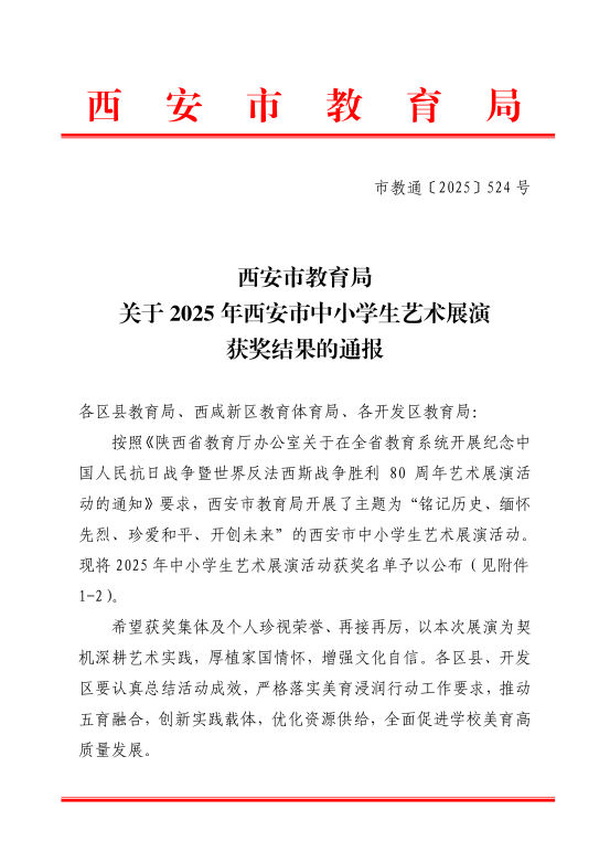 在刚刚落幕的2025年西安市中小学生艺术展演活动中,西安市第四十八中学凭借卓越的艺术教育成果与学子们的出色表现,喜获多项大奖,特此向全校师生及社会各界报喜!