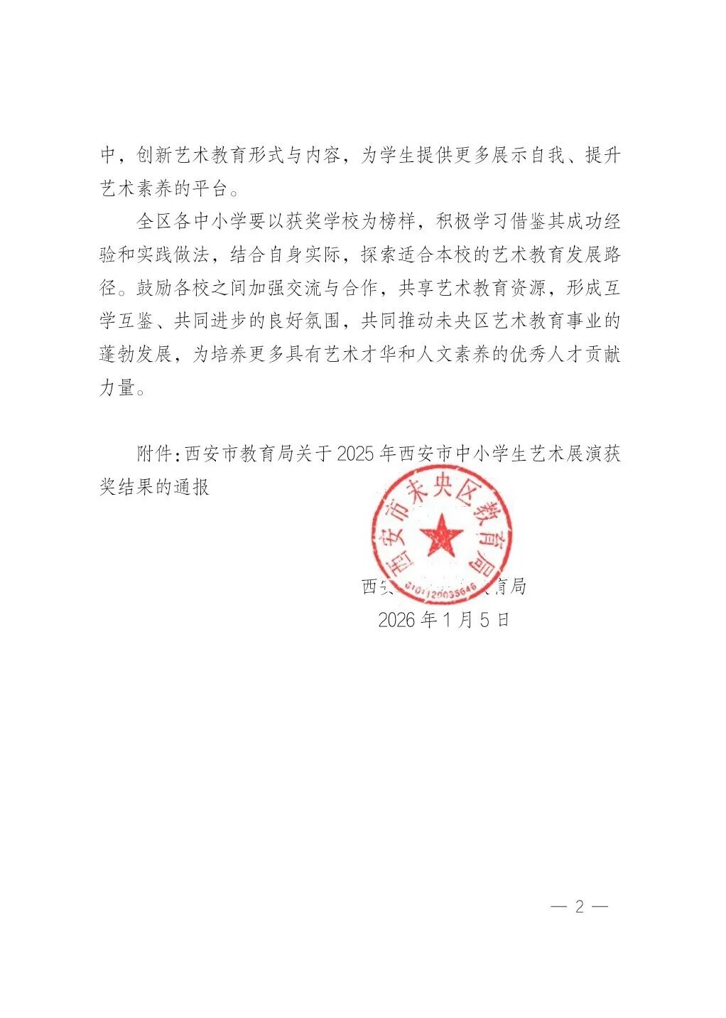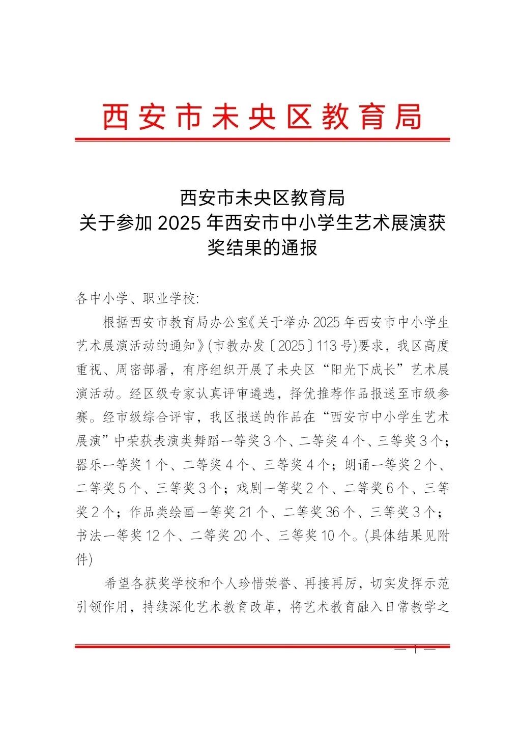 西安市第四十八中学谨向在本次艺术展演活动中获奖的全体师生表示最热烈的祝贺和最衷心的感谢!你们的辛勤付出与卓越表现,不仅为个人赢得了荣誉,更为学校增添了光彩。此次获奖,既是对西安市第四十八中学艺术教育成果的充分肯定,更是对师生们不懈努力与才华的最佳褒奖。学校始终致力于培养学生的艺术素养和创新能力,通过丰富多彩的艺术活动,激发学生的艺术潜能,提升其综合素质。希望获奖师生珍惜荣誉,再接再厉,持续深耕艺术实践,提升艺术修养,为学校艺术教育事业的蓬勃发展贡献更大力量。