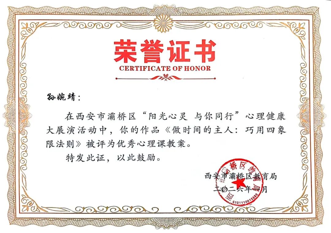 孙婉靖老师设计的《做时间的主人:巧用四象限法则》荣获心理课教案初中组三等奖