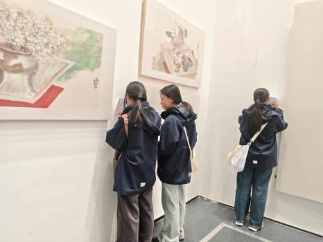 步入展厅,同学们便被一幅幅精美的画作与丰富的文献资料所吸引。本次展览系统回顾了伍眉画社二十年来走过的艺术道路与丰硕成果,共展出张小琴、石丹、石英、韩莉、傅小宁五位女画家的精品力作350幅。