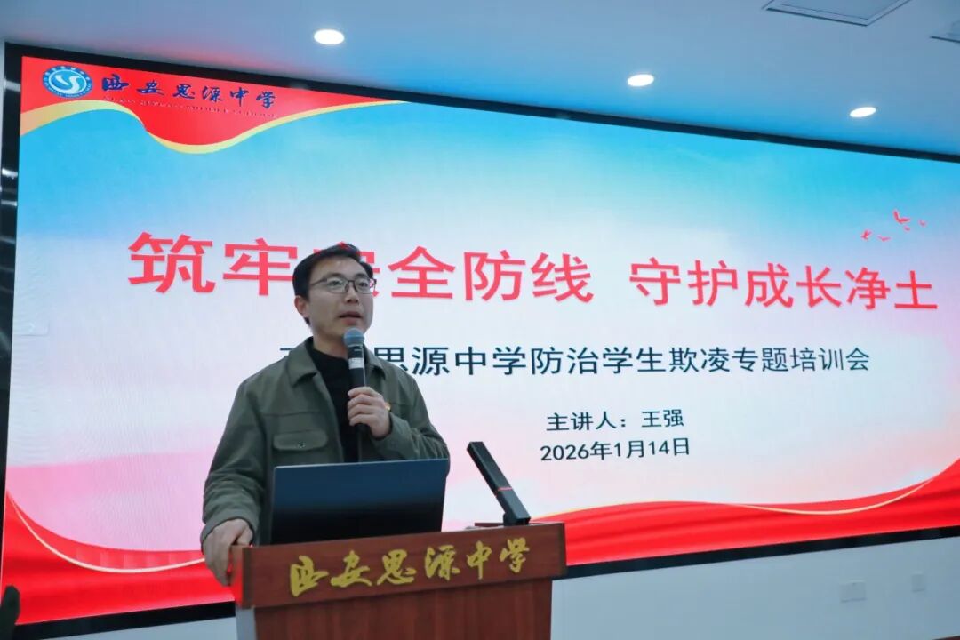 2026年1月14日下午,西安思源中学组织开展防治学生欺凌专题培训会,全体教职工共同学习2026年1月1日正式施行的新修订《中华人民共和国治安管理处罚法》,以法治力量守护学生健康成长。此次培训由德育副校长王强主讲。