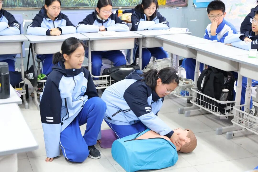 在“国际医疗急救”的课堂上,同学们全神贯注地模拟演练心肺复苏和海姆立克急救法,每一次按压都是对生命的敬畏,更是责任感的生动实践。