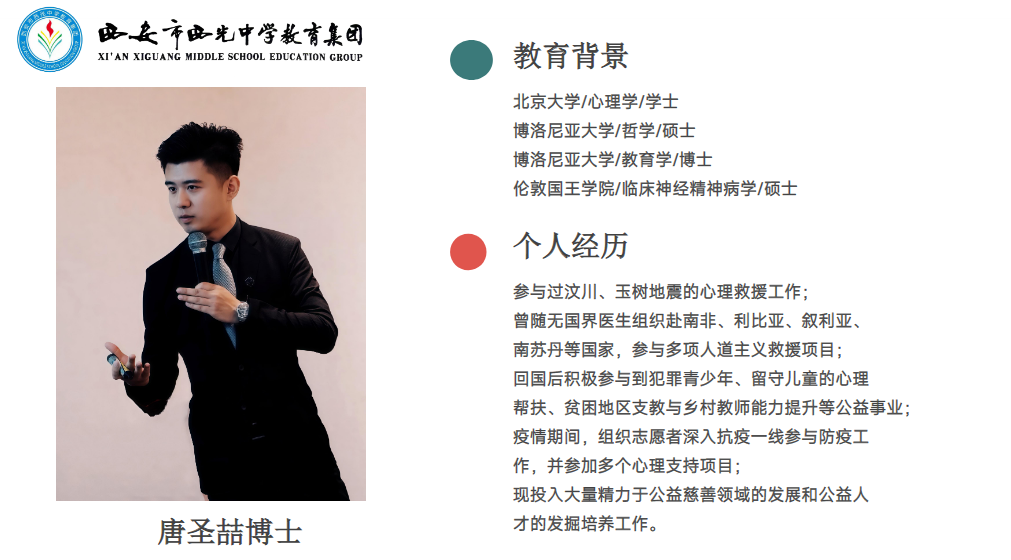 2026 年 1 月 7 日,西安市西光中学教育集团汇文校区对家长开放的公益课堂温情开讲。活动由政教处鲁姗姗主任主持,特邀唐圣喆博士带来《如何理解青春期学生心理》专题分享,为现场家长们送上了一场干货满满的亲子教育“及时雨”。