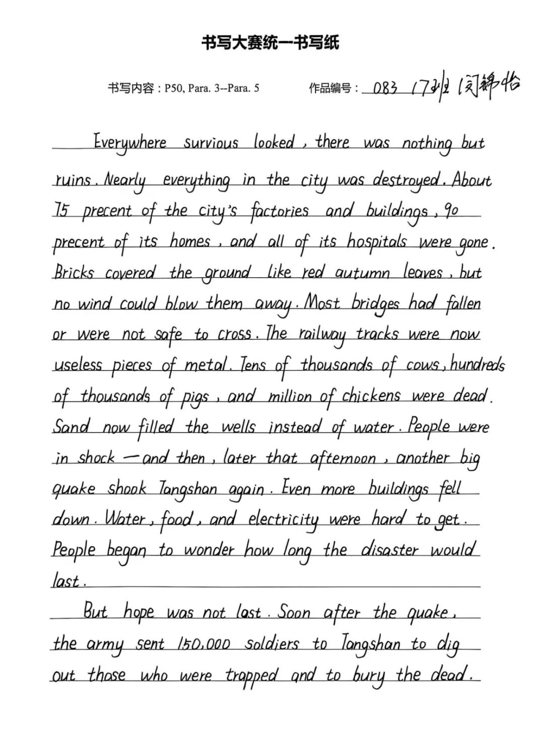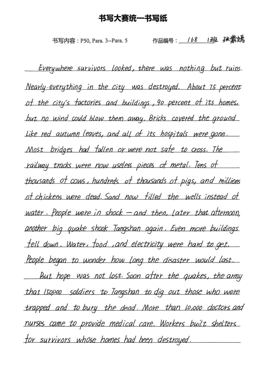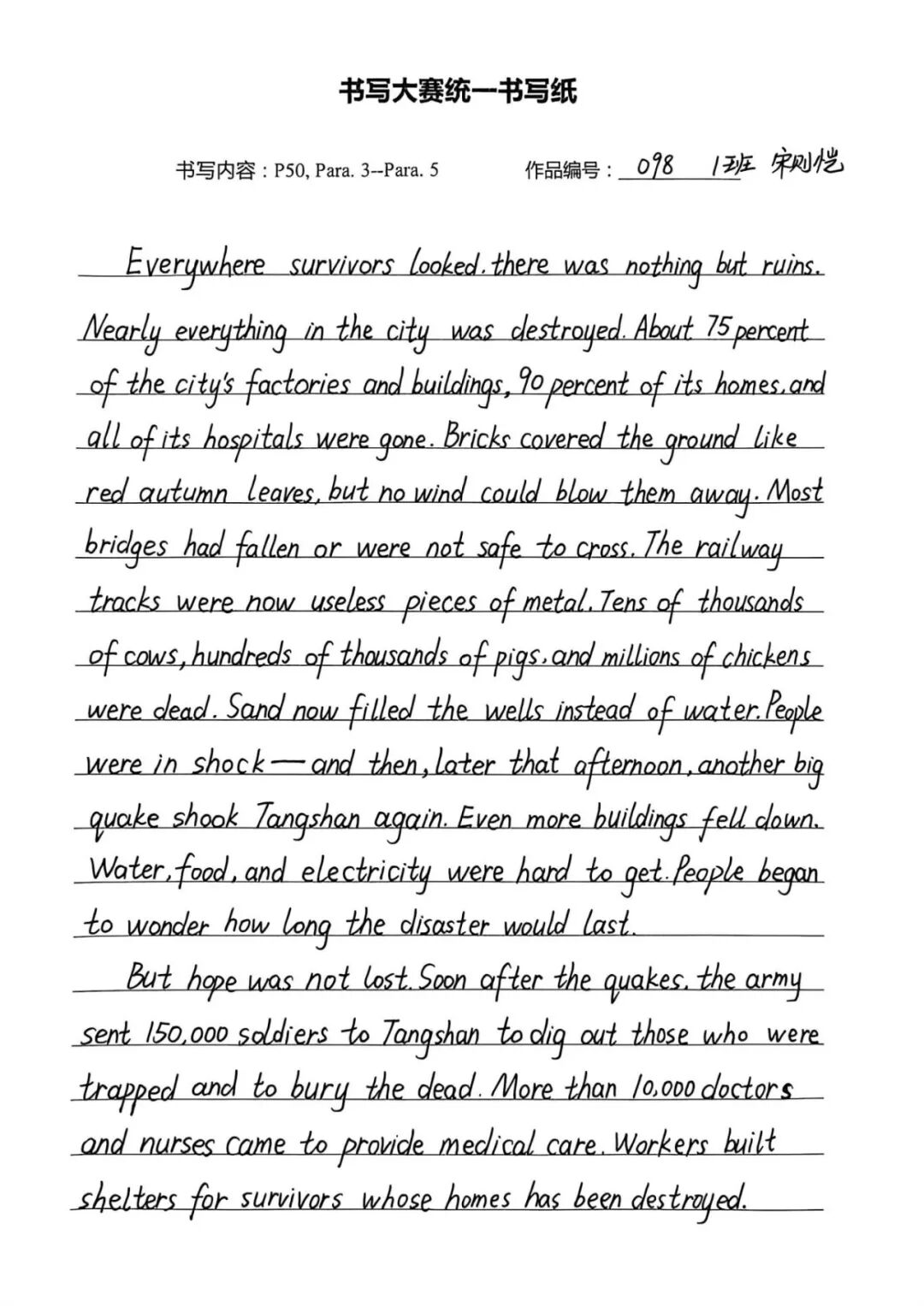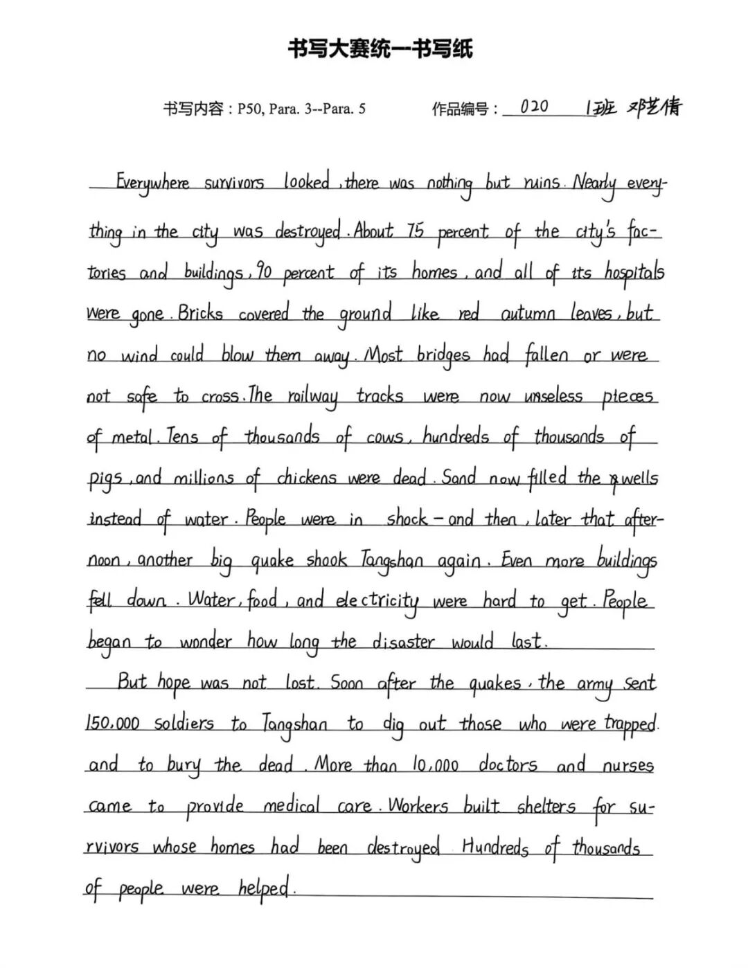 此次英语书写大赛,既是纠正书写陋习、规范书写格式的“练兵场”,也是巩固人教版必修一教材核心知识的“强化营”,更是学子们展示自我风采、增强学习自信的“大舞台”。