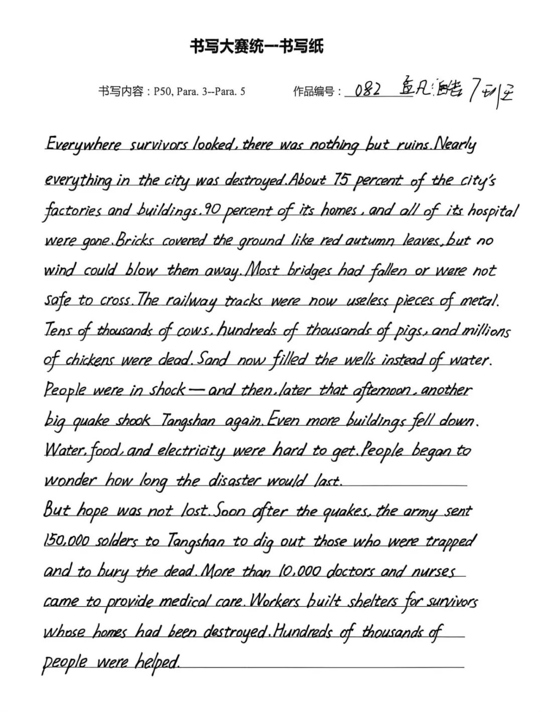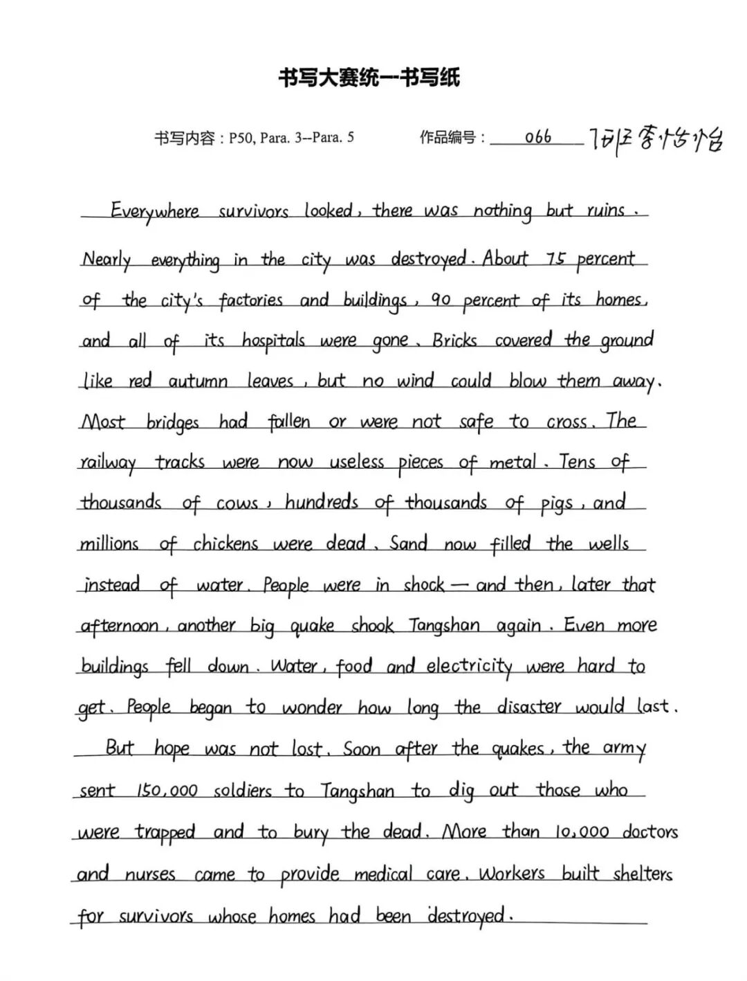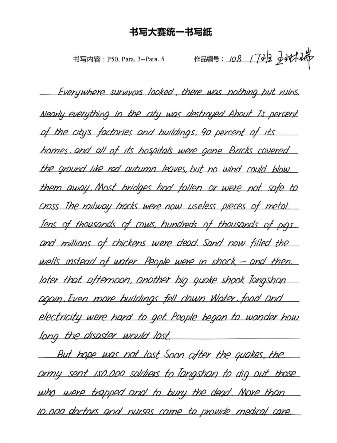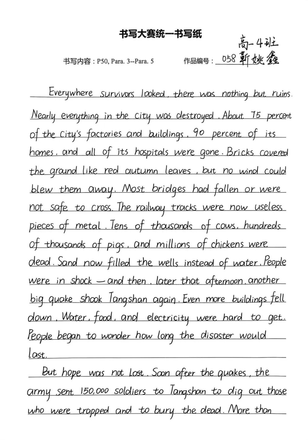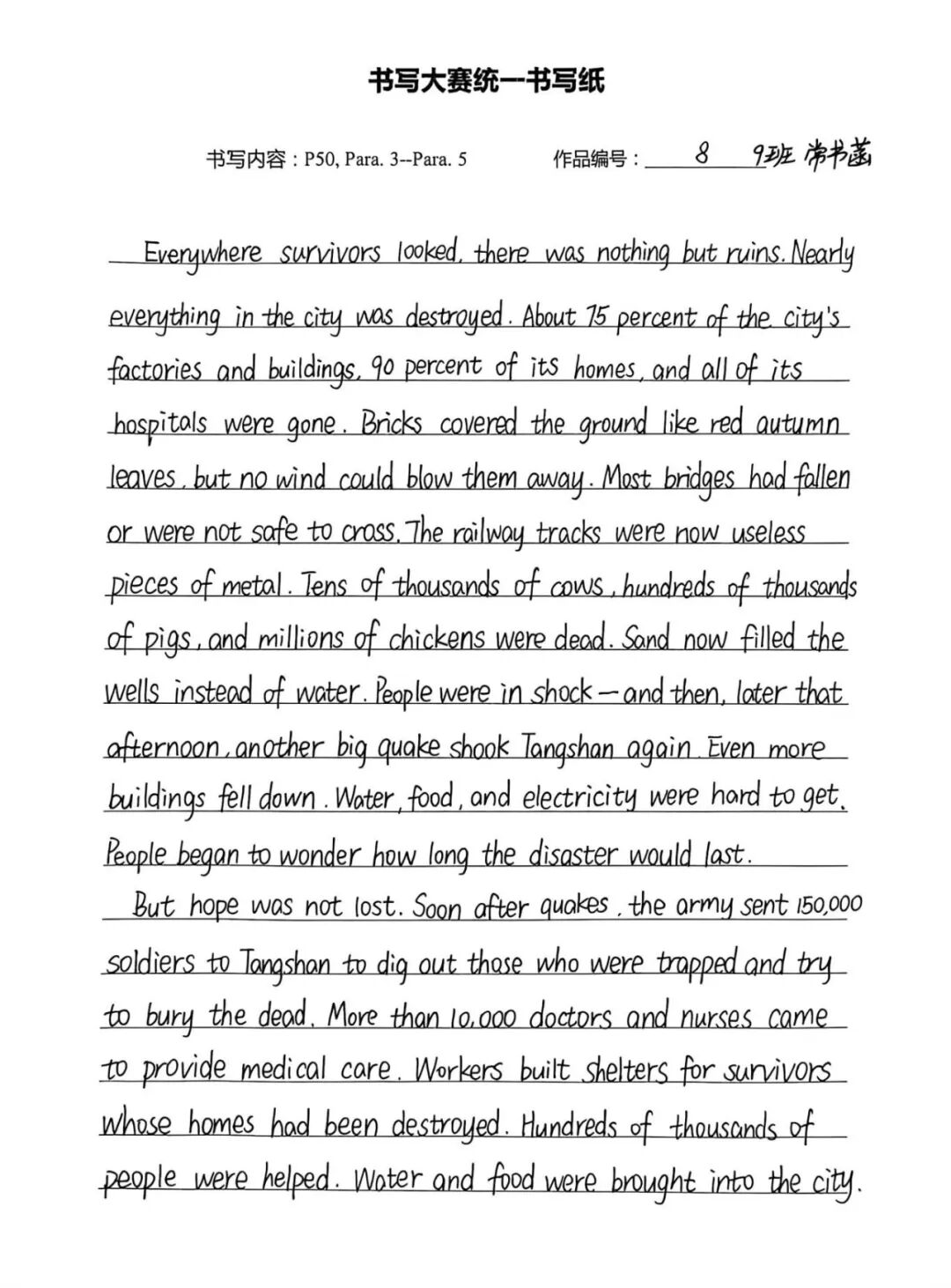 此次英语书写大赛,既是纠正书写陋习、规范书写格式的“练兵场”,也是巩固人教版必修一教材核心知识的“强化营”,更是学子们展示自我风采、增强学习自信的“大舞台”。