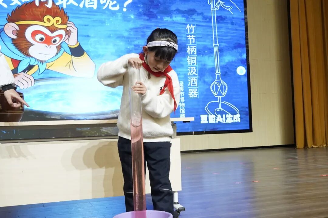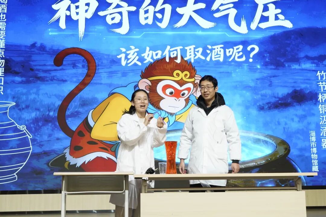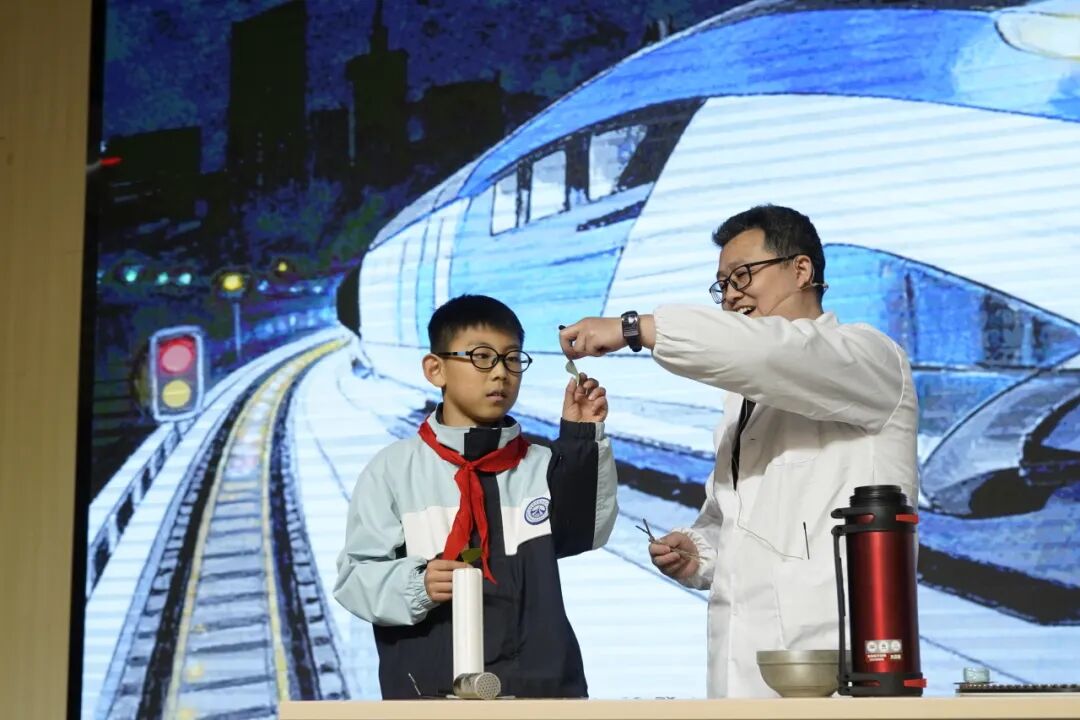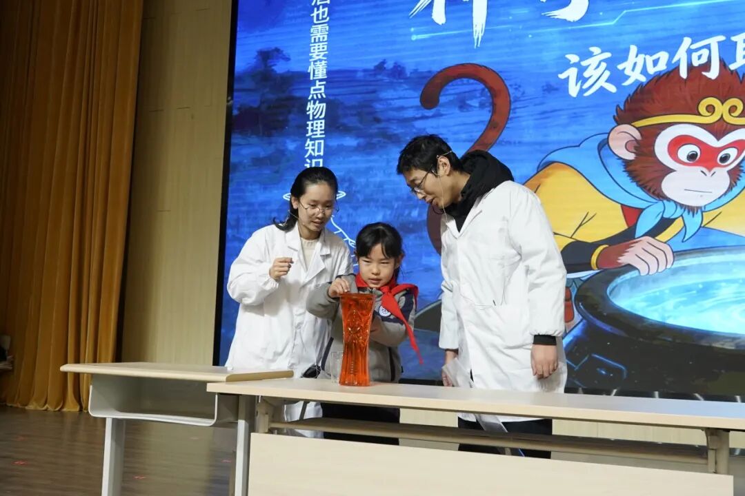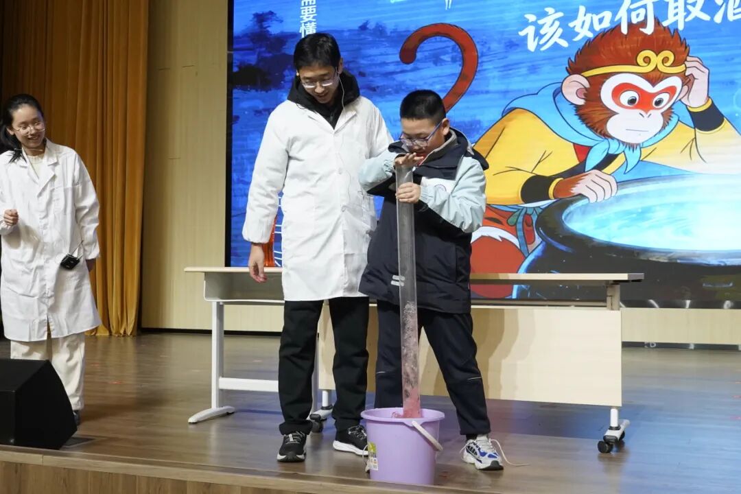 第二篇章聚焦探索力与压强的奥秘。李行老师和陈睿琪老师通过《神奇的大气压,引水向上》实验,展示了大气压如何影响液体流动,令人震撼的演示让同学们感受到了空气的强大力量!