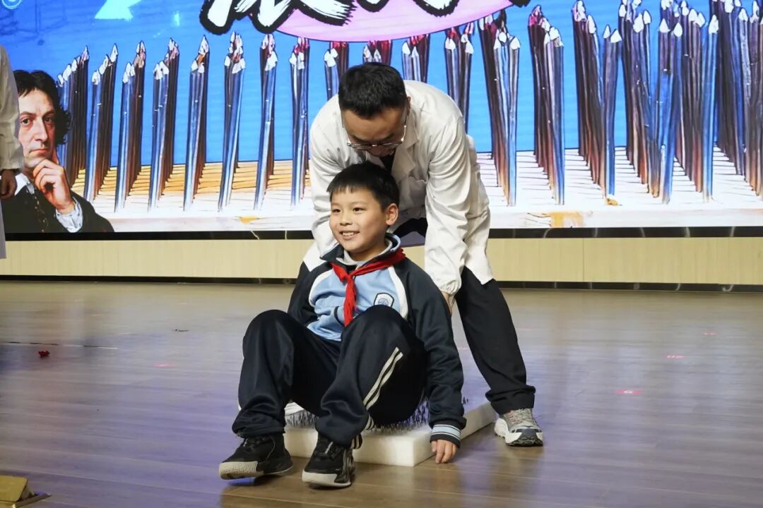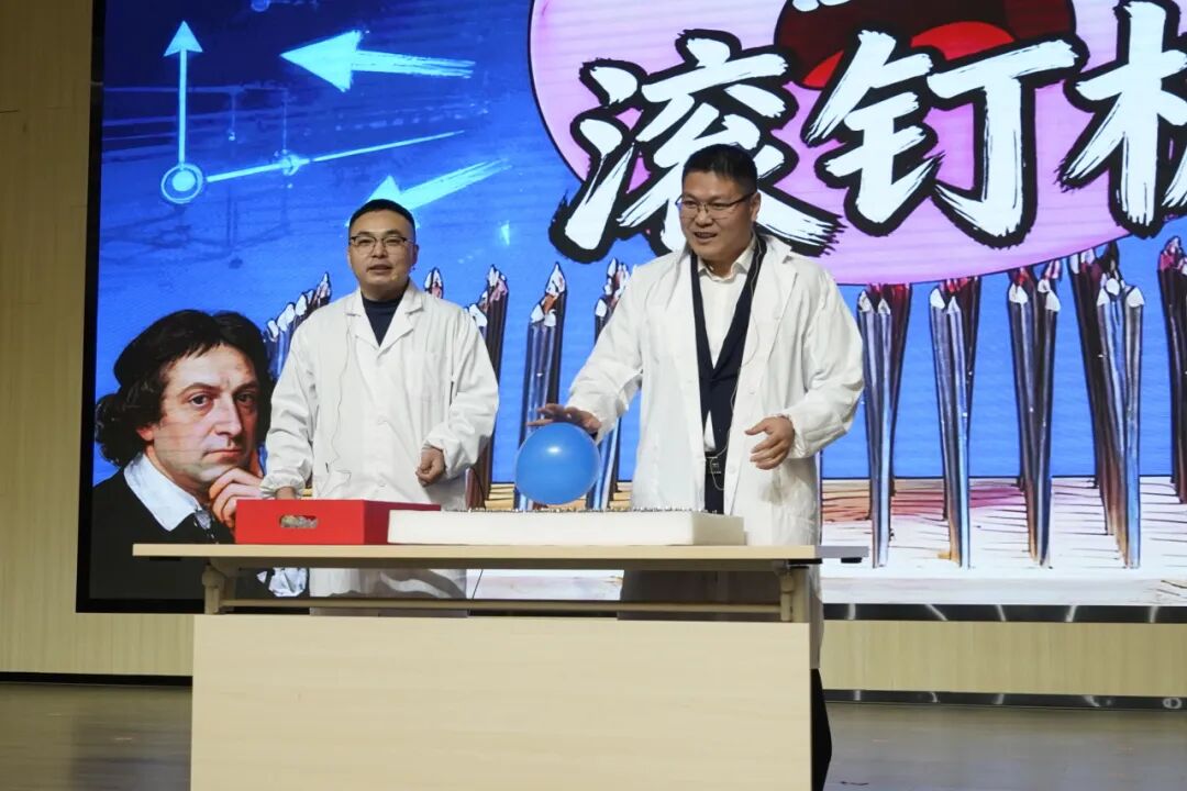 王鑫老师和李斌老师展示了《滚钉板》实验,并组织同学们亲身体验,同学们在安全互动中理解了压强分布原理。