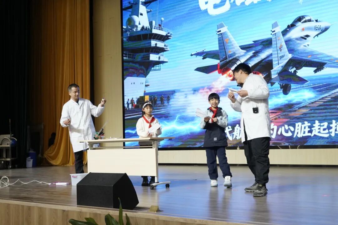 李晶老师和李超阳老师的《电磁弹射》展示了电磁原理如何将物体弹射升空,同学们仿佛亲临高科技航母的黑科技实验现场,震撼不断!
