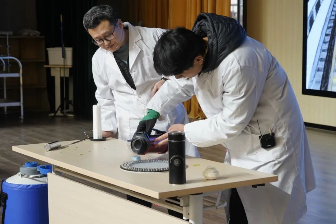 乔石老师带来了《超导磁悬浮》实验,在现代物理的魅力下,同学们亲眼见证了物体在磁场中凌空悬浮的神奇现象。