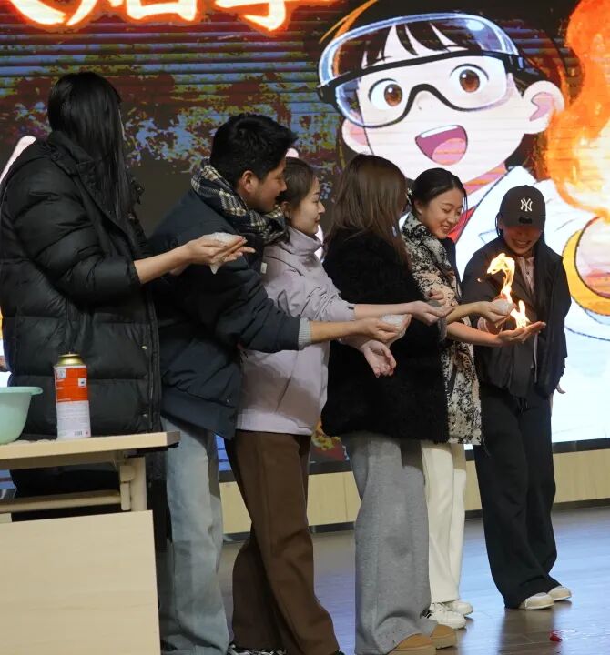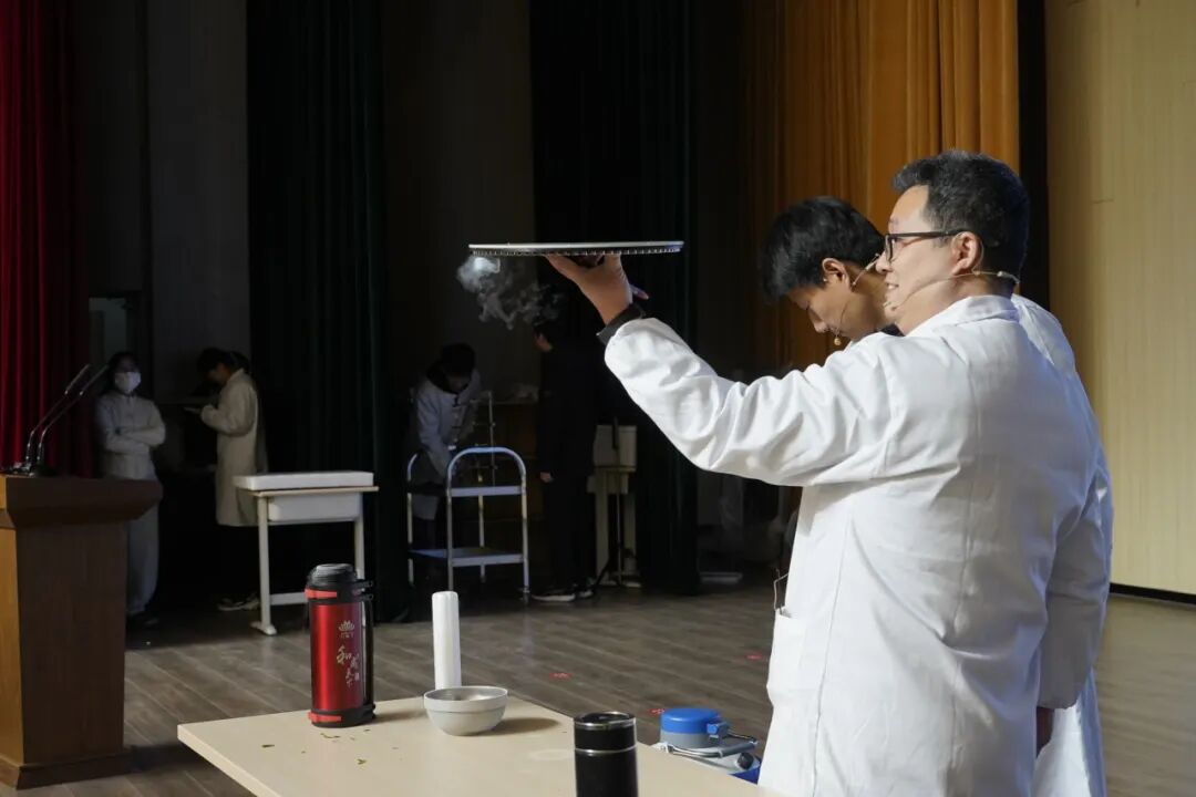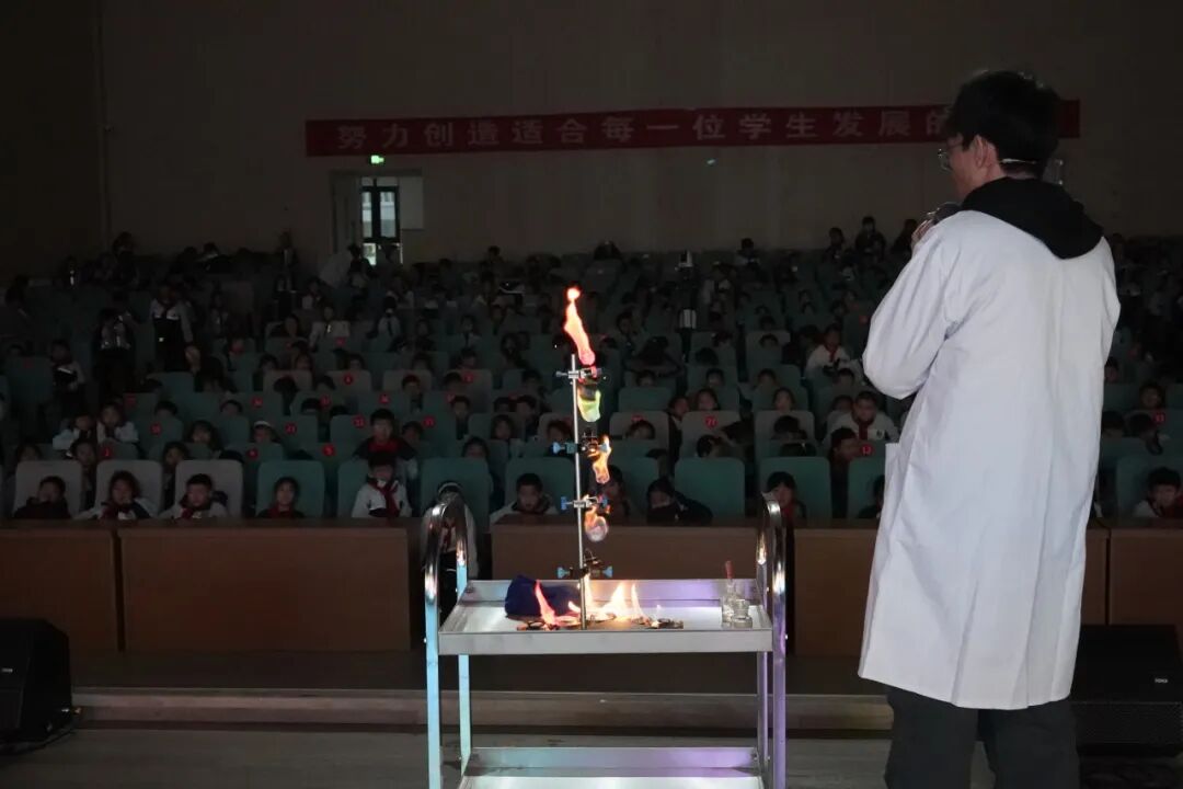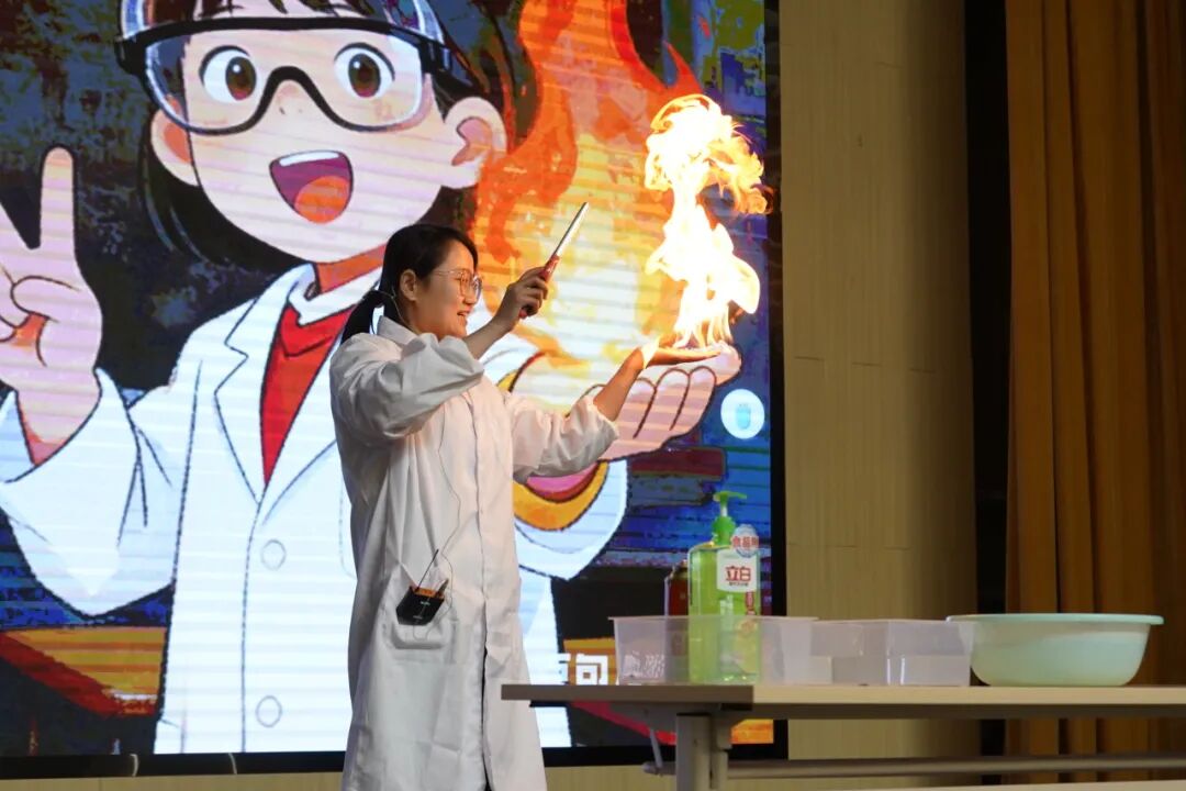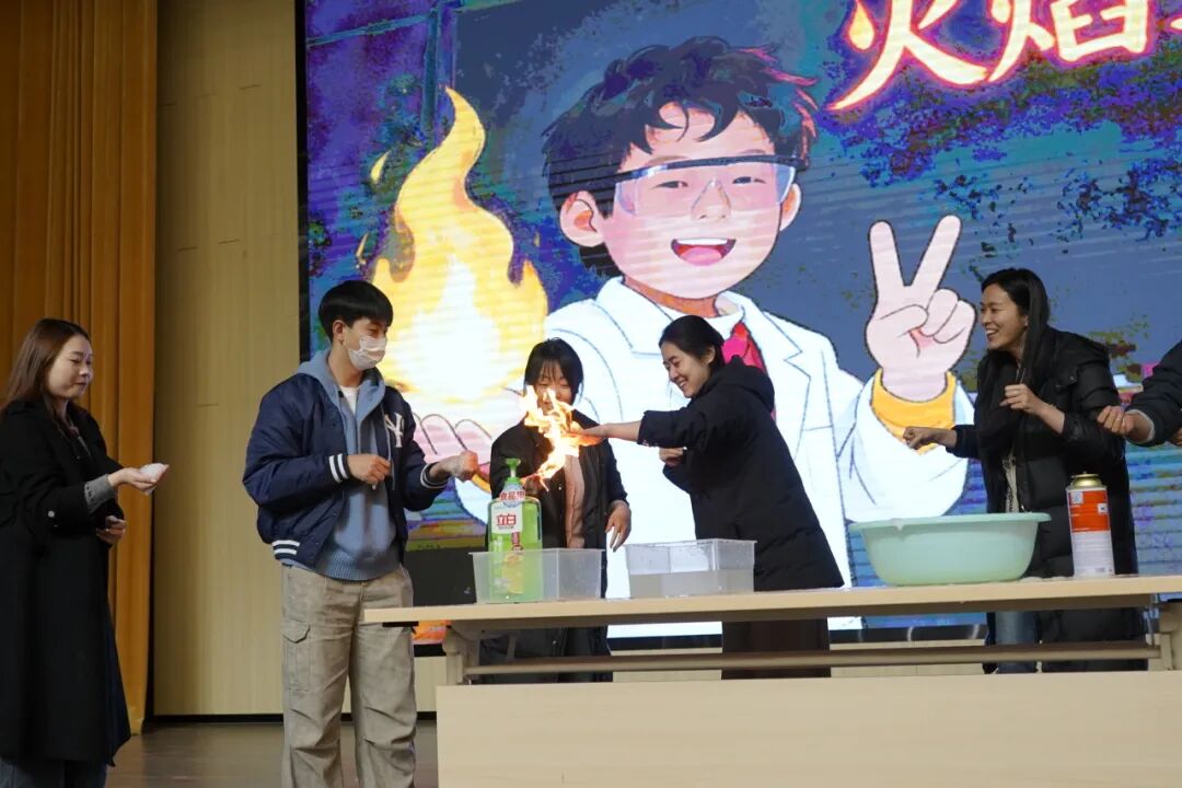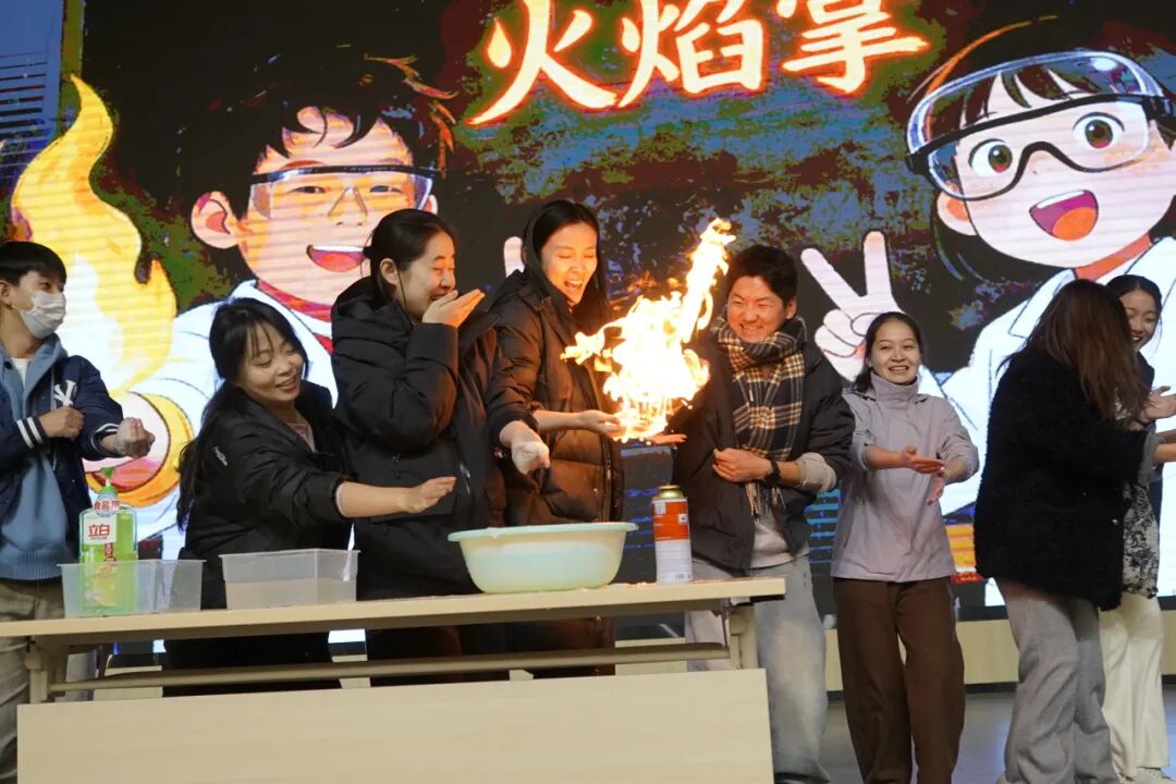 曹林老师带来的《火焰掌》演示,在严格的安全操作下,火焰于掌心传递、跃动,直观呈现出化学反应的可控与奇妙。同学们在近距离观察中惊叹不已,深刻感受到化学在日常生活的独特魅力。