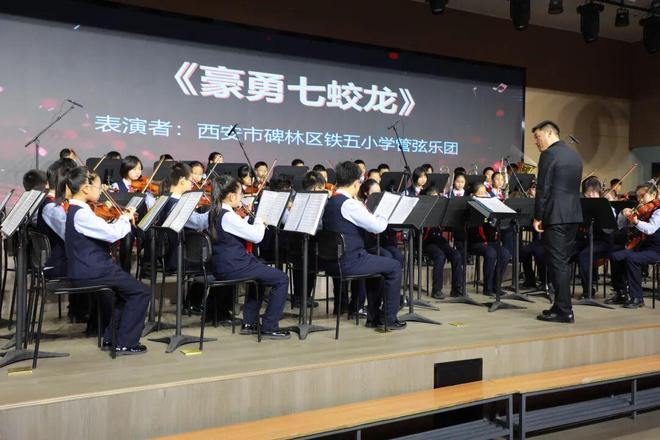 西安铁五小管弦乐团带来两首风格迥异的经典演奏。一曲《豪勇七蛟龙》旋律恢弘大气、节奏铿锵有力,少年乐手们凭借娴熟技艺,将乐曲中的英雄豪迈气概与团结精神展现得淋漓尽致,激昂乐声震撼人心;另一首《茉莉花》被誉为“中国第二国歌”,婉转流畅的曲调尽显东方美学的含蓄优雅,乐团以西洋乐器全新演绎,让传统韵味与交响质感碰撞出别样火花,尽显文化传承的多元魅力。