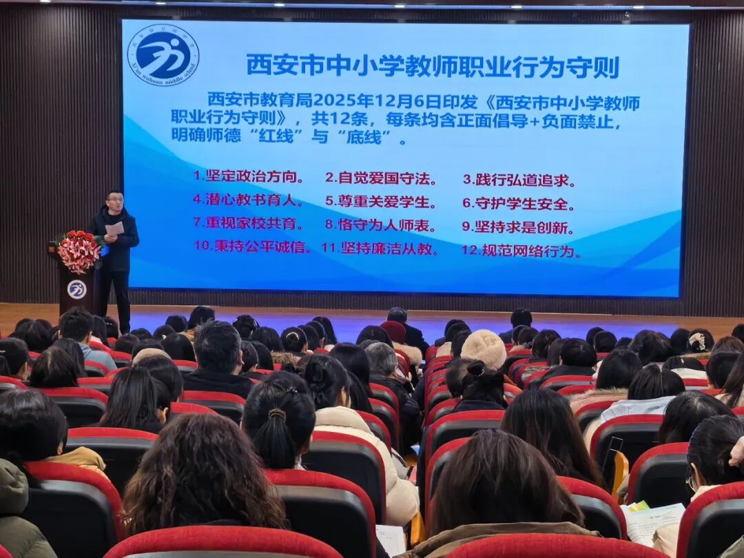 培训会上,学校党总支书记郑红科结合真实教育案例,对最新下发的《西安市中小学教师职业行为守则》进行了深入解读。他强调:新时代教师必须“提高站位、坚守初心”,将职业行为规范内化于心、外化于行,真正做到“行为世范、潜心育人”。这不仅是对教师职业底线的重申,更是对师德师风高标准、高境界的引领,激励每一位教师成为学生人生道路上可信赖、可效仿的引路人。