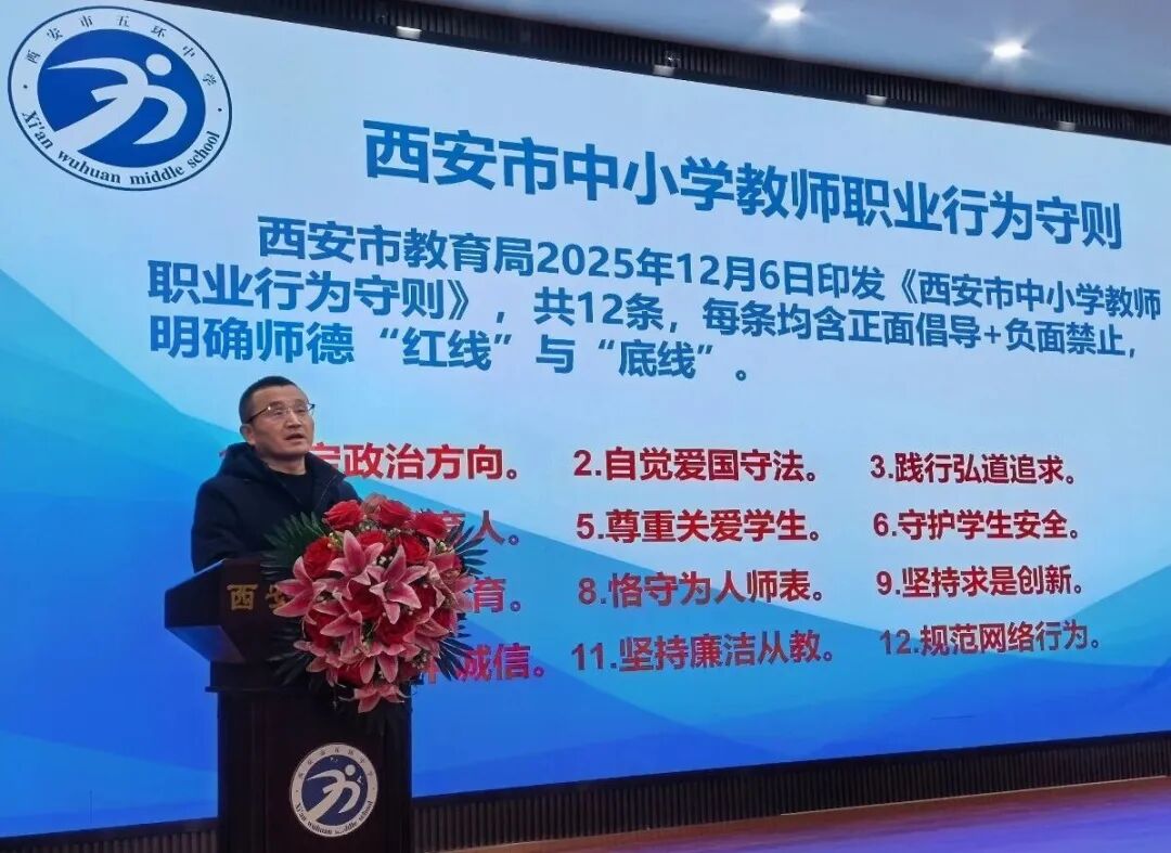 2026年1月21日,西安市五环中学全体教职工齐聚一堂,开展了一场扎实而深刻的全员培训学习。此次学习聚焦新时代教师角色重塑,通过系统学习、案例解读与职责强化,为教师队伍注入“立德树人·守护成长”的双重动能,彰显了学校适应教育发展新趋势的远见与担当。