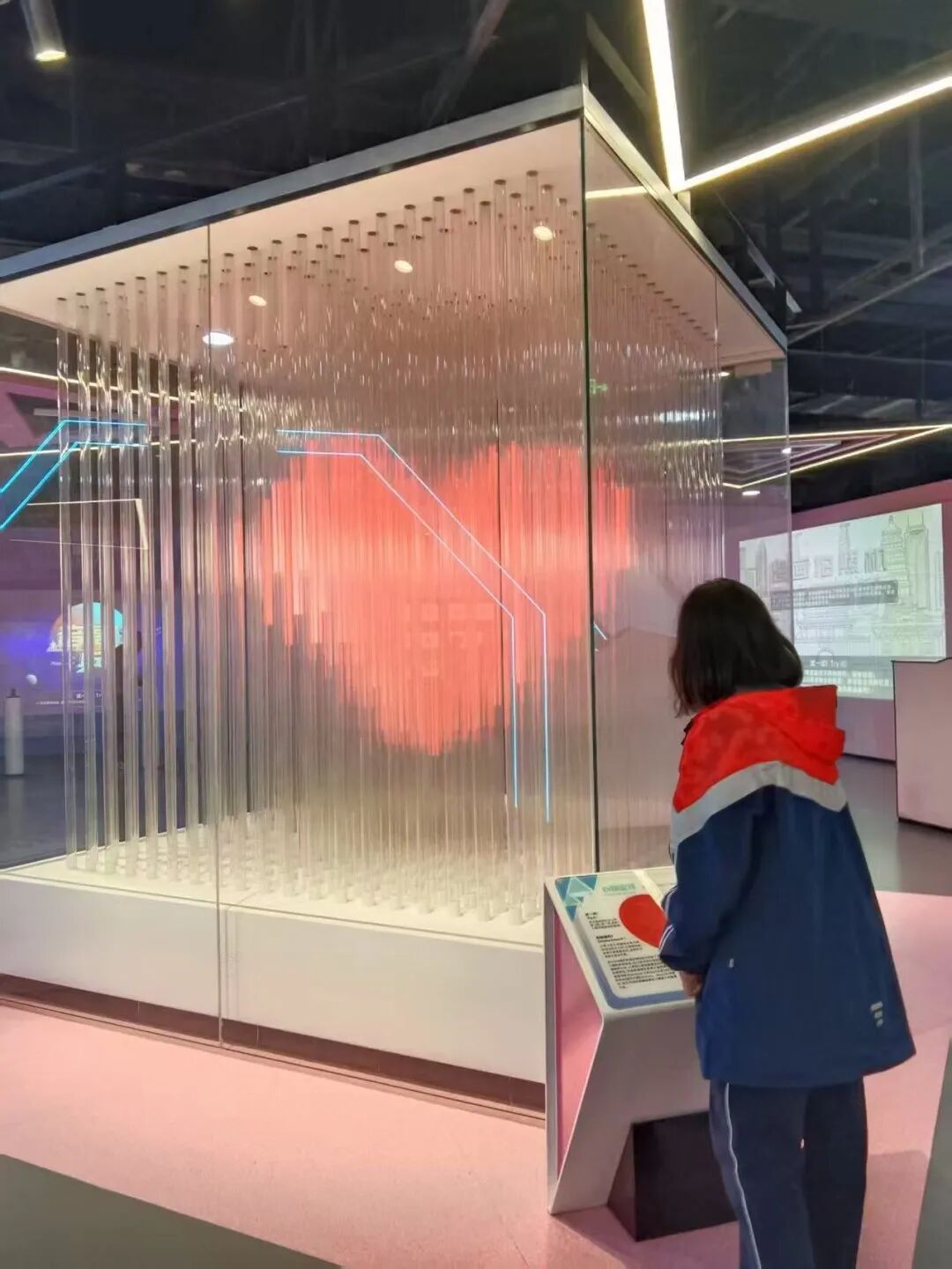 城市规划馆里,“千年溯源·东方智慧”光影展区让同学们瞬间“穿越”回盛唐长安。触摸互动屏上,古城墙的微缩模型缓缓旋转,古钟的古朴韵律在指尖流淌,同学们惊叹“原来我们脚下的土地藏着这么多历史智慧”。连接南北场馆的秦岭生态走廊更是让人流连忘返,160米长的艺术长廊通过纱幕投影技术,将太白山、终南山,老君山,金丝峡等秦岭诸多壮丽景观微缩呈现,同学们穿行其间,逼真的声、光、色沉浸式呈现,似乎漫步秦岭深处,现场感直接拉满,尽情感受着自然与科技的和谐共生。