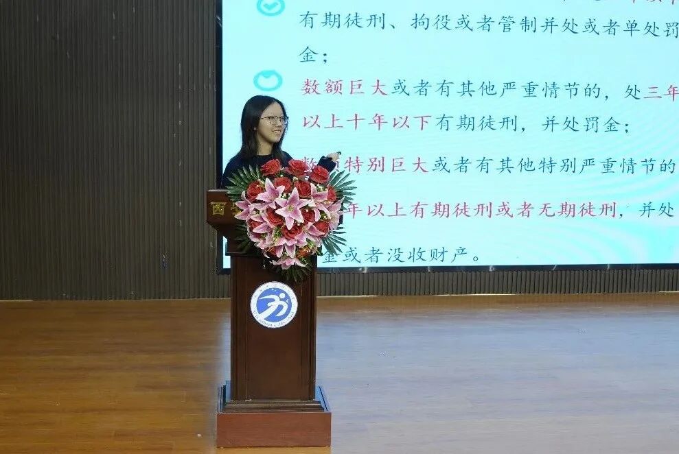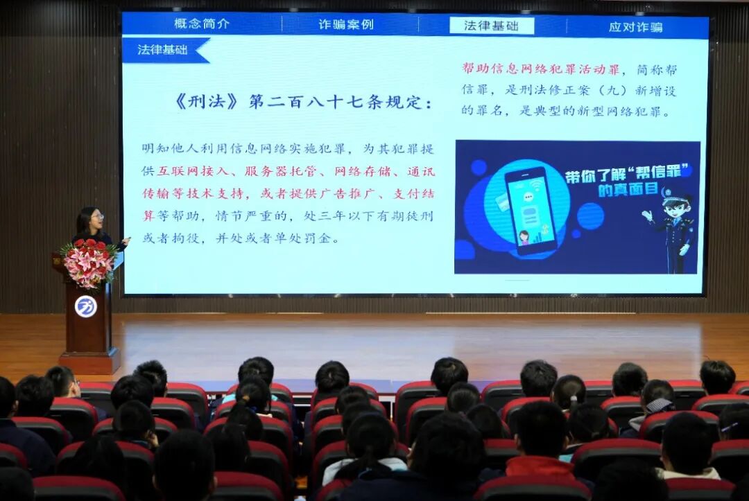 《预防电信诈骗》专题则紧密贴合现实生活。宣讲人系统梳理了当前常见电信网络诈骗的主要手段与花样翻新的作案方式,深入浅出地讲解了相关法律法规知识,并重点传授了识别诈骗陷阱、保护个人信息、及时固定证据以及寻求有效帮助的防诈反诈方法和技巧,有力提升了同学们应对潜在风险的能力。