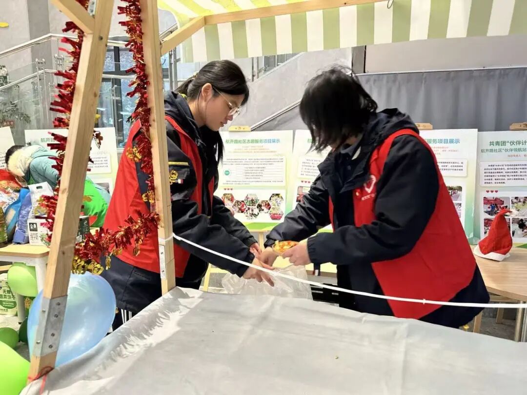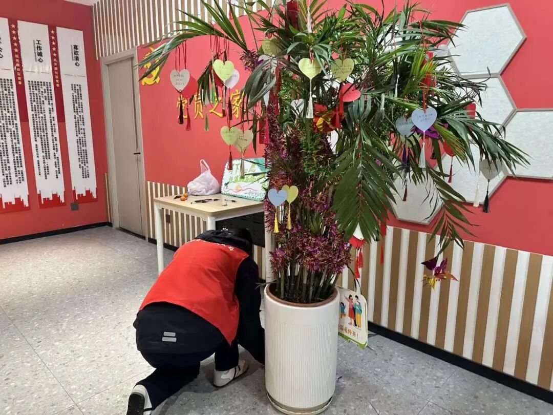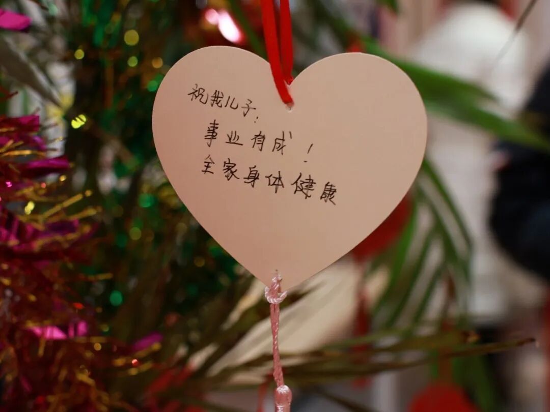 心愿树寄语点:志愿者协助书写或代录新年心愿,一张张卡片挂上心愿树,寄托美好期盼。