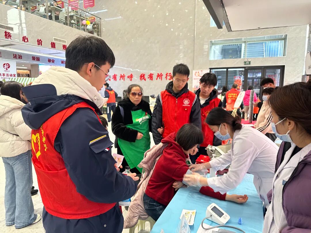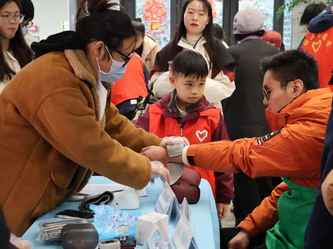 健康护航站:志愿者引导参与者接受量血压、口腔检查、心电图等服务,传递健康关怀。