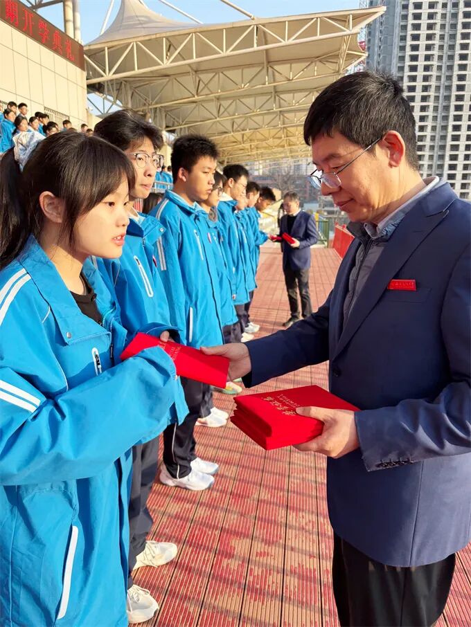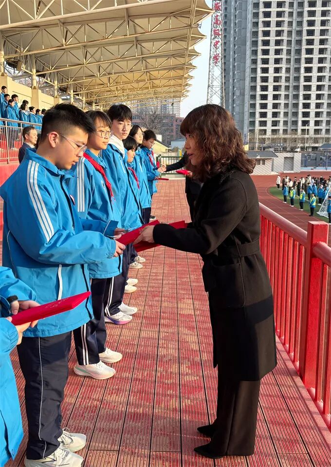 在表彰环节中,学校先后颁发了“学风评优”和“德育评优”两项荣誉。教学处主任王娟宣读“学风评优”获奖名单,辛军锋校长、焦婕副校长为获奖学生代表颁奖。