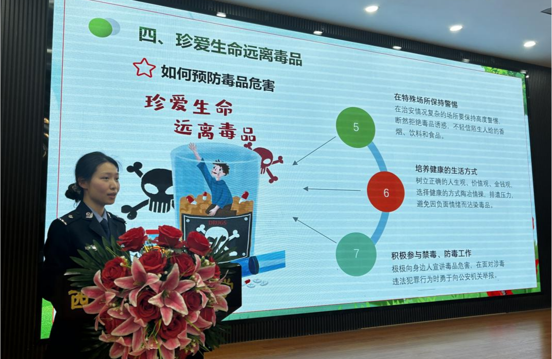 报告会上,侯佳欣警官借助真实视频、典型图片,现场互动,直观生动地讲解了毒品对身体、家庭及社会的严重危害,细致解读禁毒相关法律法规,并向全体学生发出“珍爱生命,远离毒品”的郑重倡议。她勉励同学们学以致用,切实提升识毒、防毒、拒毒能力,主动争做禁毒志愿者、宣传员,积极为禁毒事业贡献青春力量。