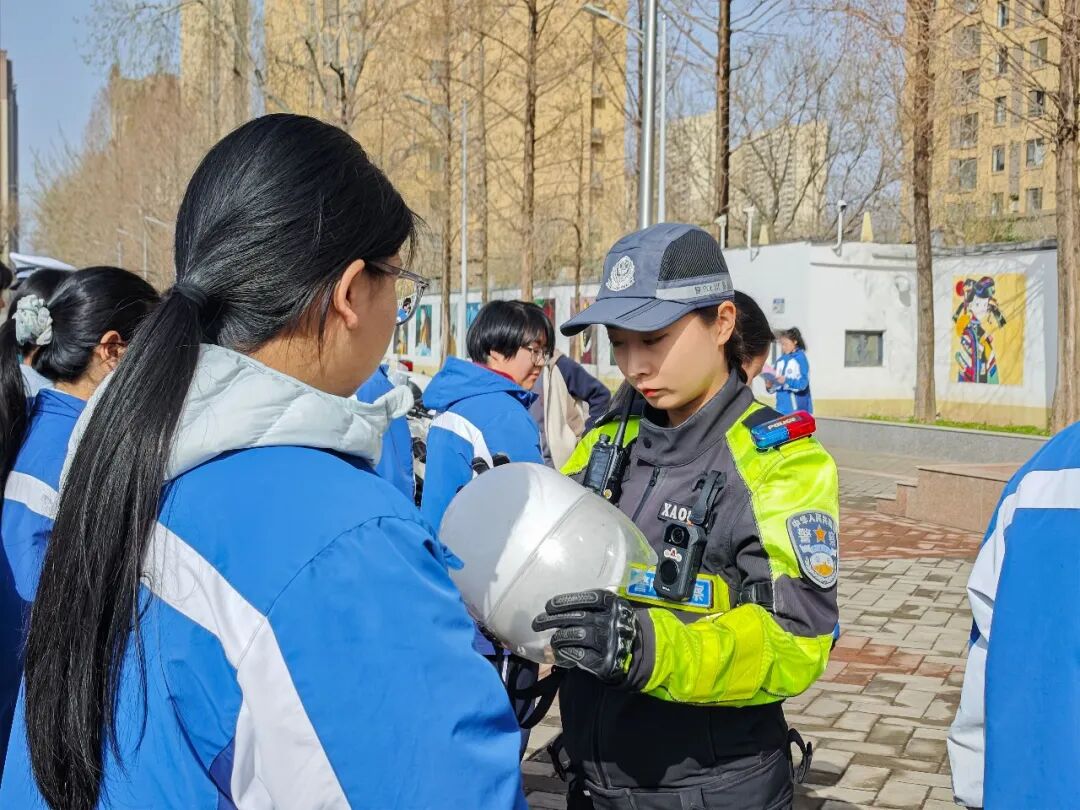 交警现场演示头盔正确佩戴步骤,邀请学生上台互动,手把手指导规范佩戴要领,让师生切实掌握安全防护技能。