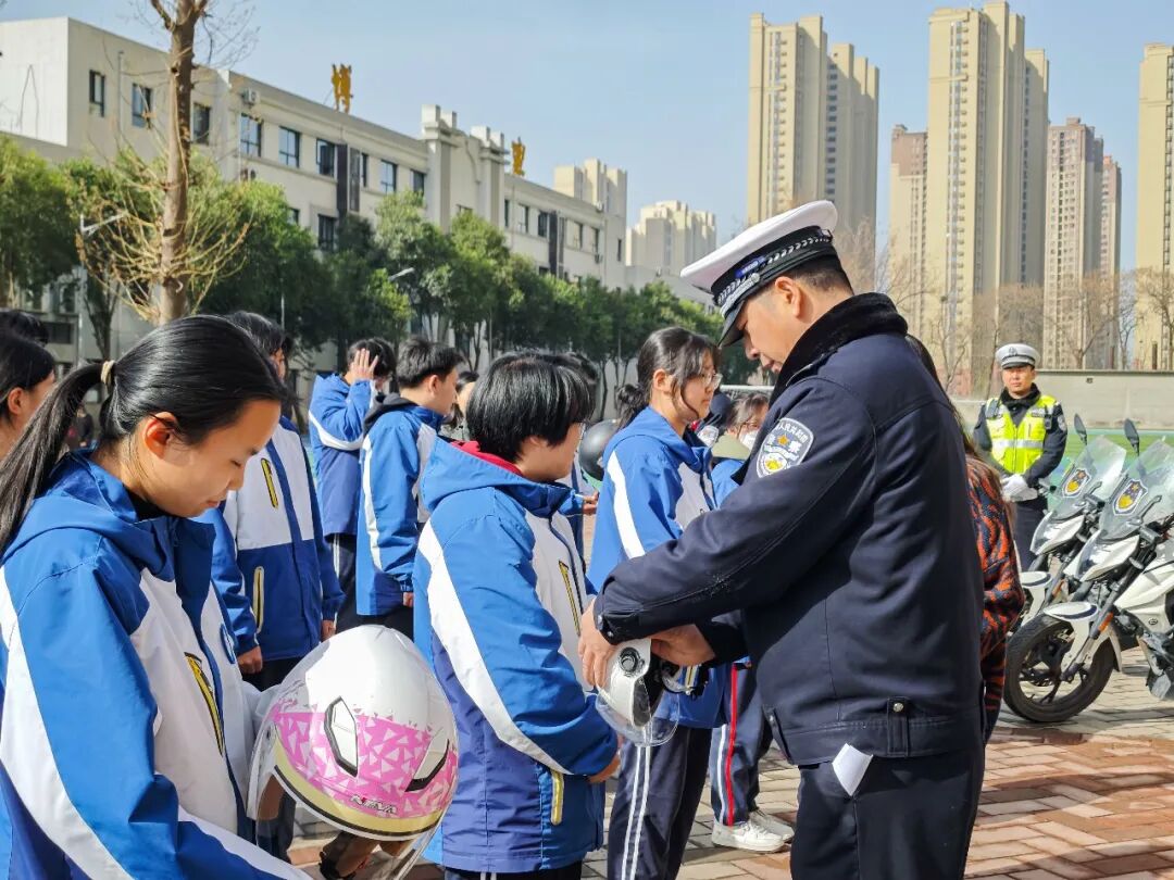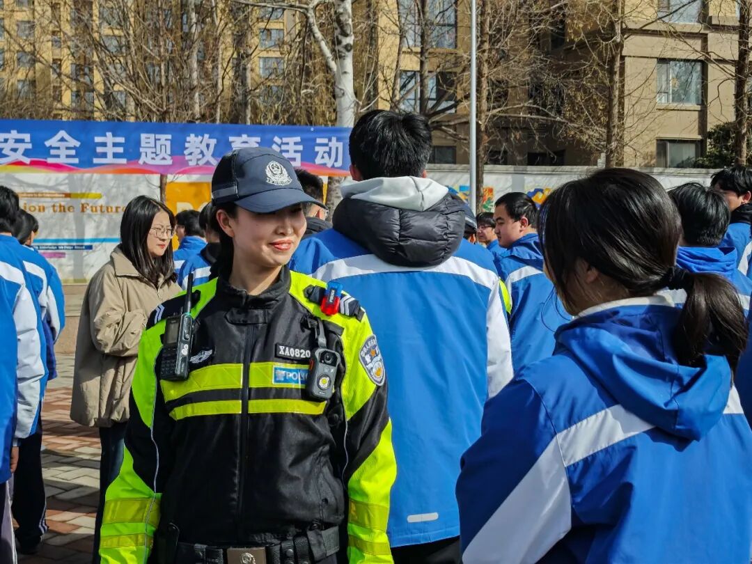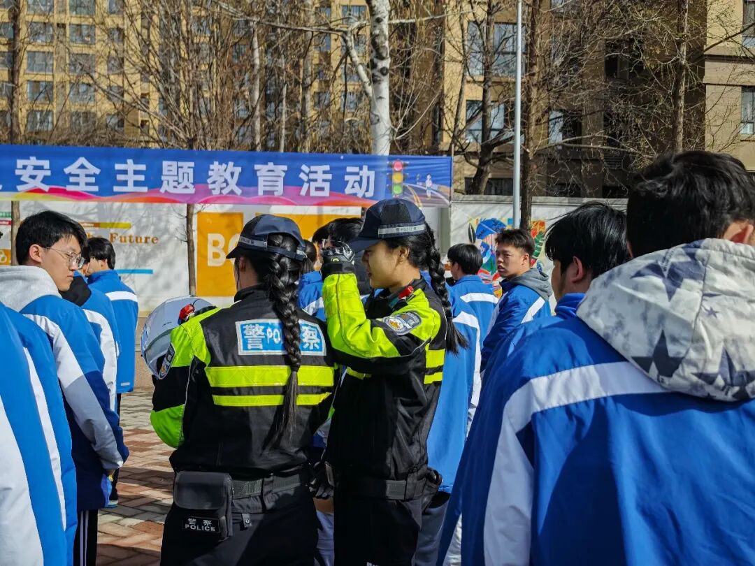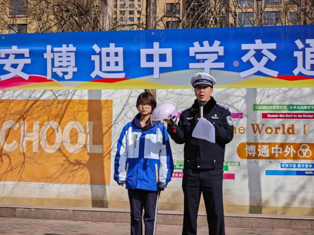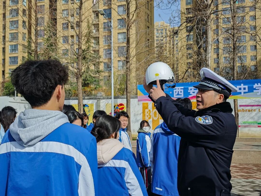 3月20日上午,西安博迪学校联合西安市公安局交管支队高新大队执勤六中队开展“一盔一带”交通安全主题教育活动,全校初高中师生参与,筑牢校园交通安全防线。