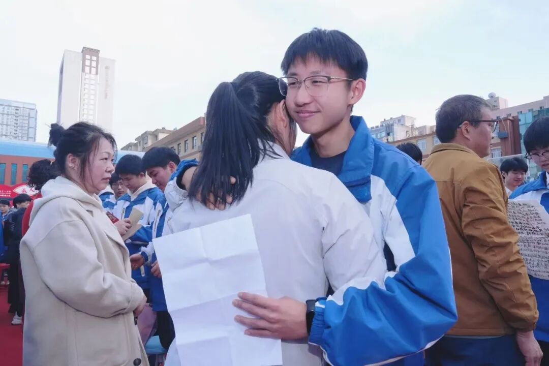 在全场温情的氛围中,学子们转身与父母深情相拥,一个拥抱,道尽千言万语,化解所有隔阂,感恩父母十八载的朝夕相伴,感恩父母一路的包容与守护,这份温暖的亲情,将成为少年们奔赴远方最坚定的底气。