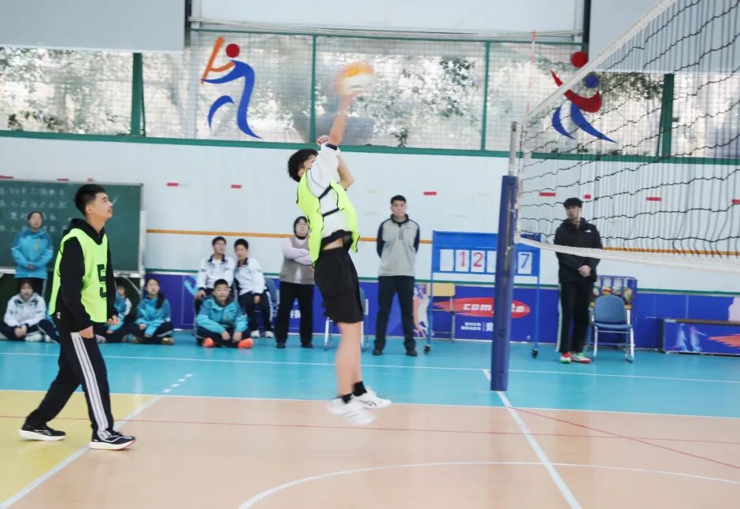 首场对决中,同学们化身运动健儿激烈角逐:主攻手大力扣杀,二传手精准传接,防守队员奋力救球,默契配合赢得全场喝彩。场边啦啦队助威呐喊,将氛围推向高潮。