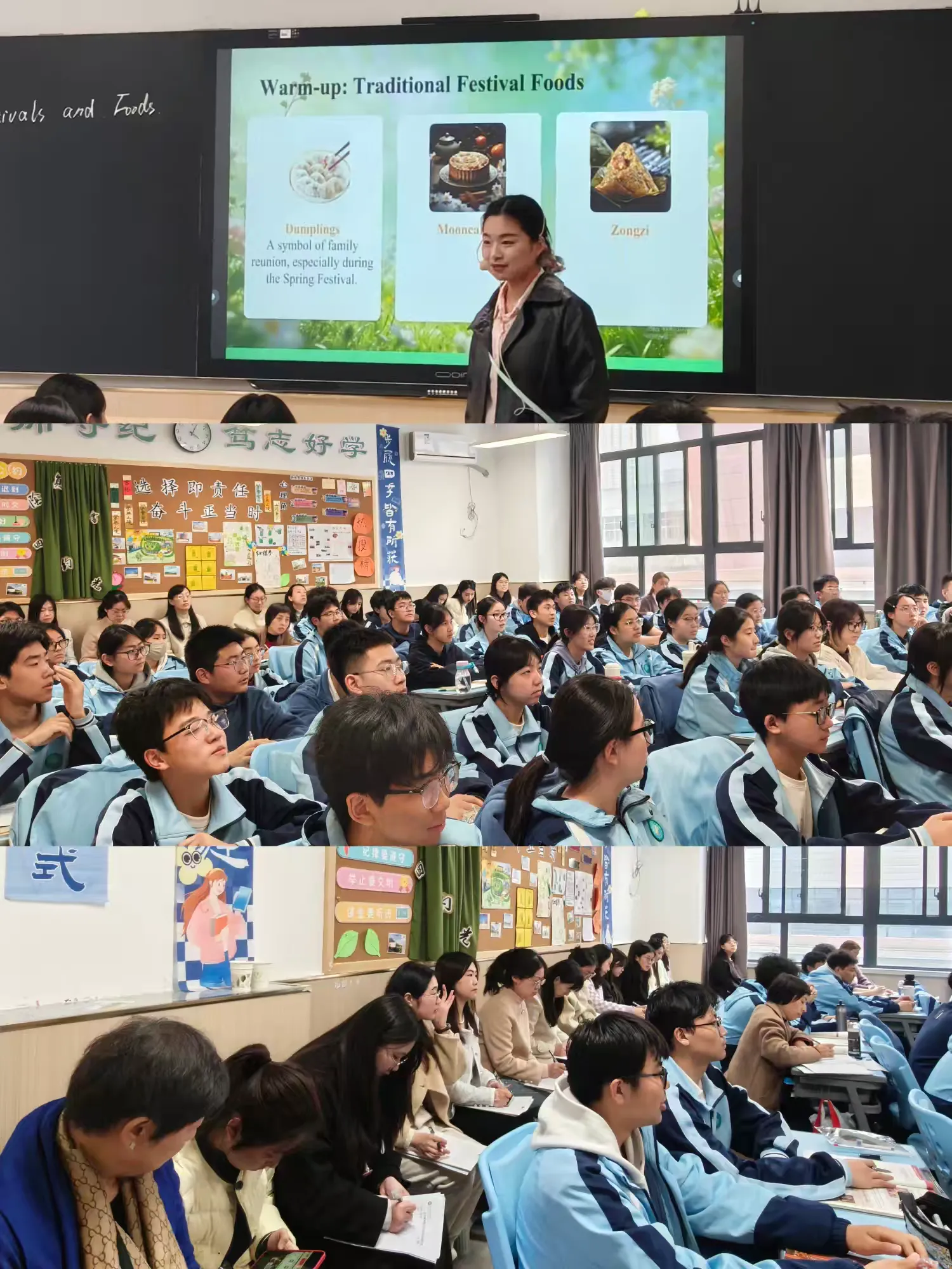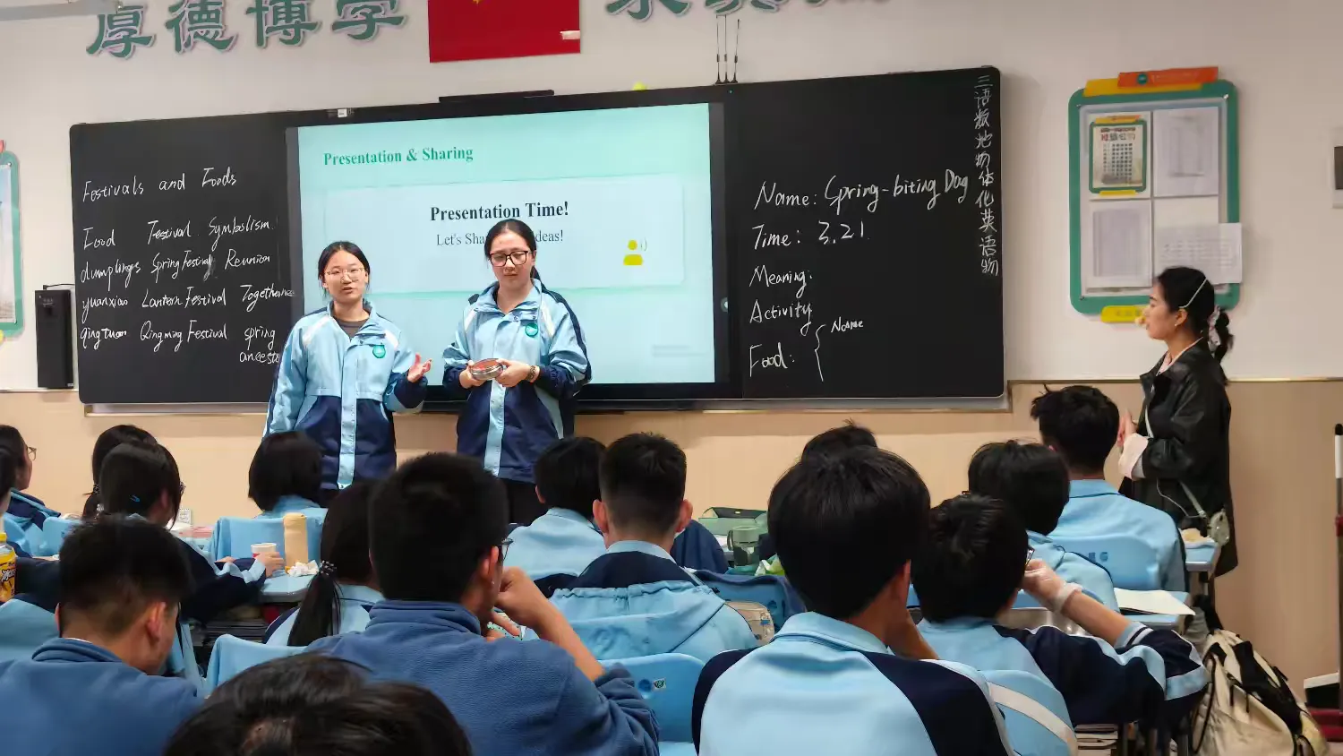 陈梦玮老师本节课以新课标英语核心素养为导向,围绕“Spring Biting Day”美食设计主题,将语言学习与文化体验相结合,秉持“以文化为内核、以语言为工具、以项目为驱动”的设计理念,让学生在感知传统节日饮食文化的基础上,完成从语言输入到创意输出的闭环。 课堂亮点突出:一是以外国友人微信互动导入,贴近生活且激发表达欲;二是语言输入精准适配任务,词汇、句型紧扣美食设计与文化阐释,实用性强;三是小组合作设计环节兼顾创意发挥与文化渗透,让学生在实践中体会饮食文化的内涵;四是全程以春为线索,从内容到形式营造春日氛围,同时通过设计、展示、写作,逐层升级强化学生的文化自信与英语综合运用能力。