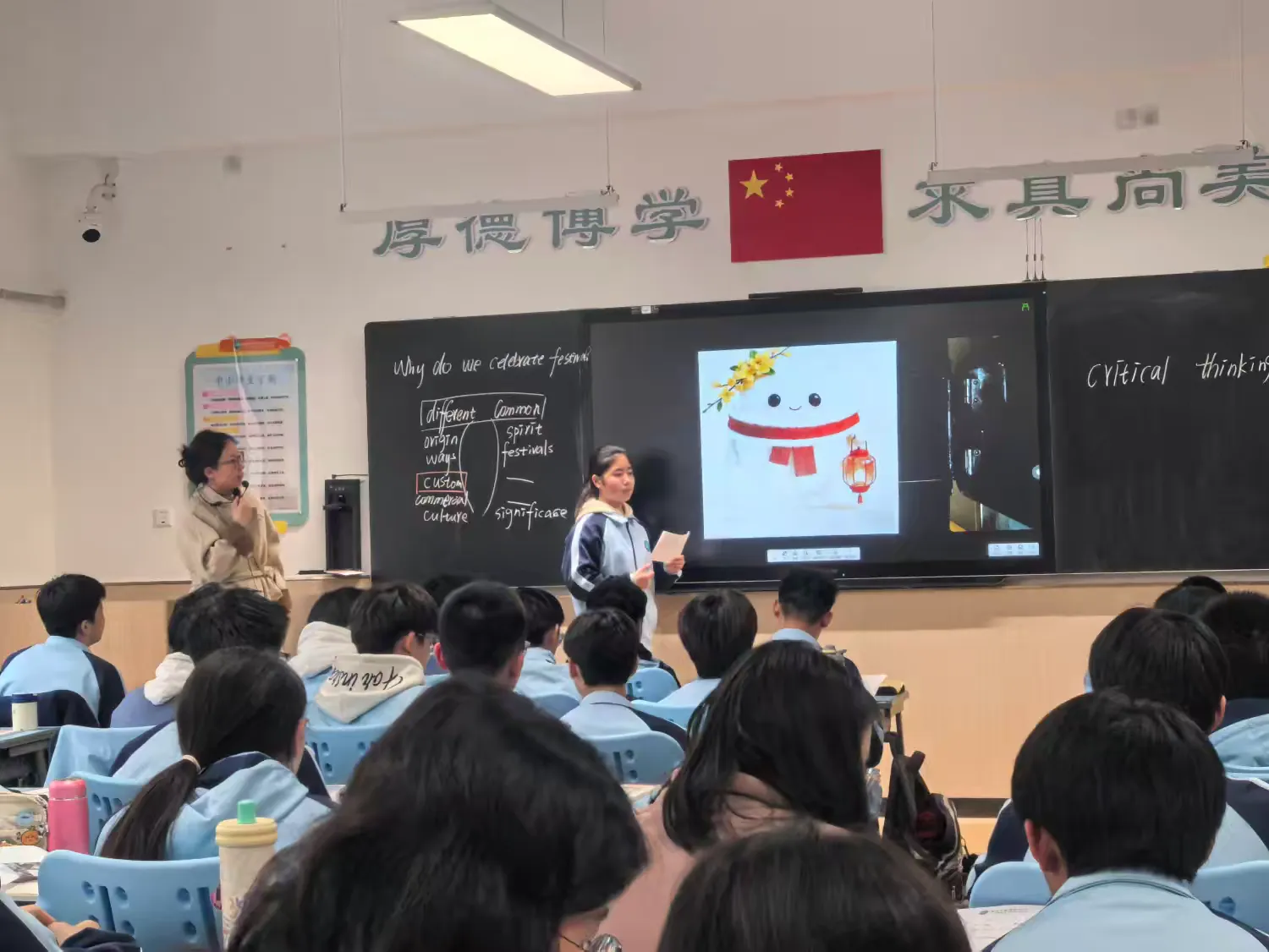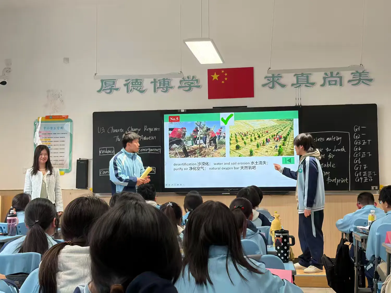 课堂上,三位教师立足学科核心素养,紧扣“环境保护”单元主题,以真实情境为引,以思维进阶为线,或巧设追问,或组织思辨,引导学生在文本研读中感悟责任,在小组协作中生成表达。学生们自信登台展示,用英语分享环保行动、节日吉祥物、节日美食等,课堂既有理性的深度,亦有平凡烟火的温度。