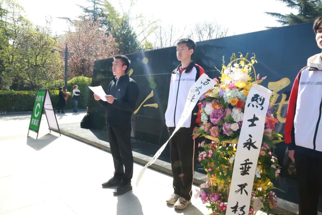 随后校党总支书记侯建峰上前,神情庄重地整理花篮挽联,并号召师生铭记英烈事迹、传承英烈精神,将对先烈的缅怀转化为奋进的动力,以实际行动践行新时代青少年的责任与担当。最后团员代表高一一班李华博随后上台发言,字字铿锵、句句深情,表达了新时代青少年对革命先烈的深切缅怀,以及传承先烈遗志、勇担时代使命、立志成才报国的坚定决心。