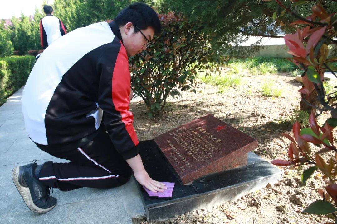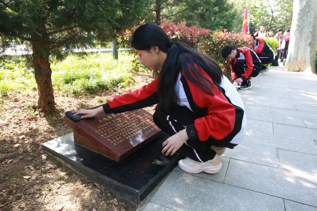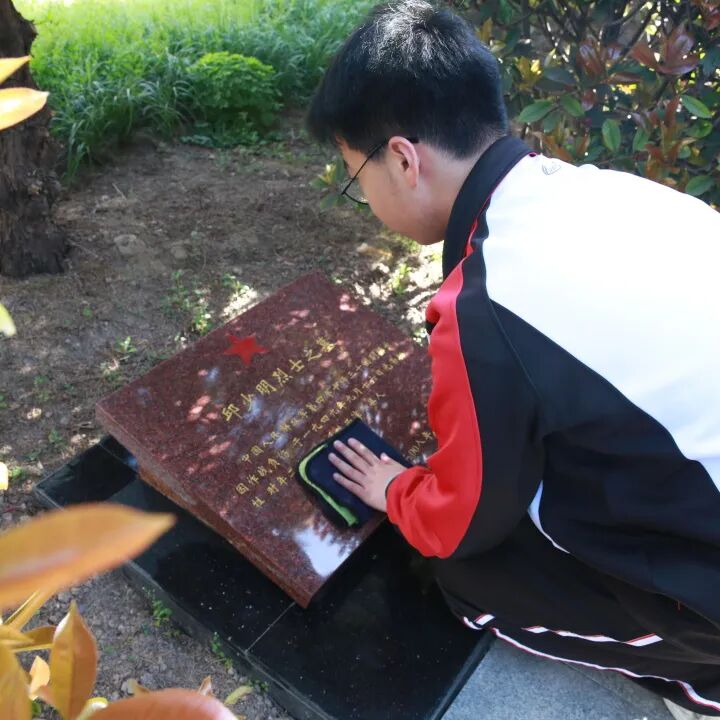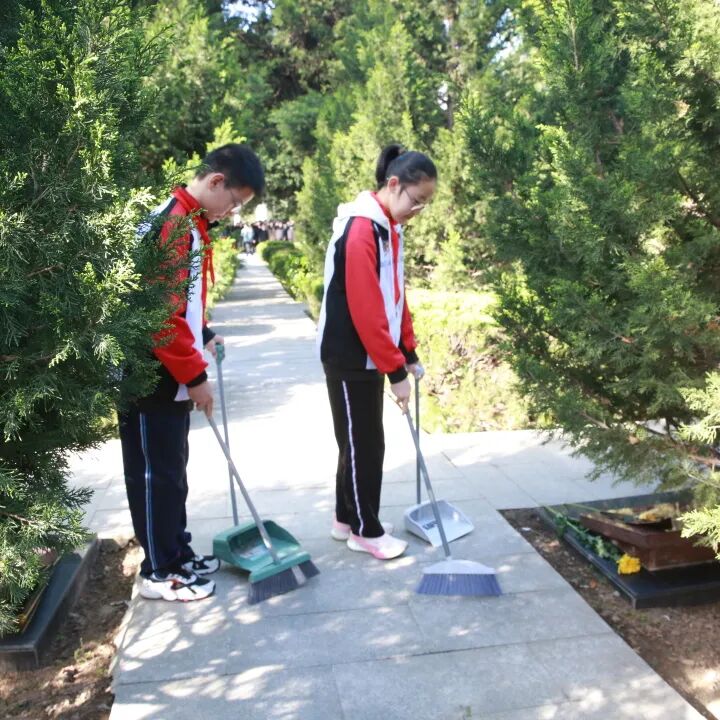 仪式结束后,师生们有序走进烈士墓区,首先全场师生进行默哀,在静谧中缅怀烈士,接着学生手持清洁工具,认真清扫墓碑周边的落叶与杂物,仔细擦拭每一块烈士墓碑,用双手拂去岁月尘埃,以朴素行动寄托追思之情。大家在墓碑前驻足凝视,缅怀先烈们的英雄事迹,在静默中感悟信仰力量、赓续红色血脉。