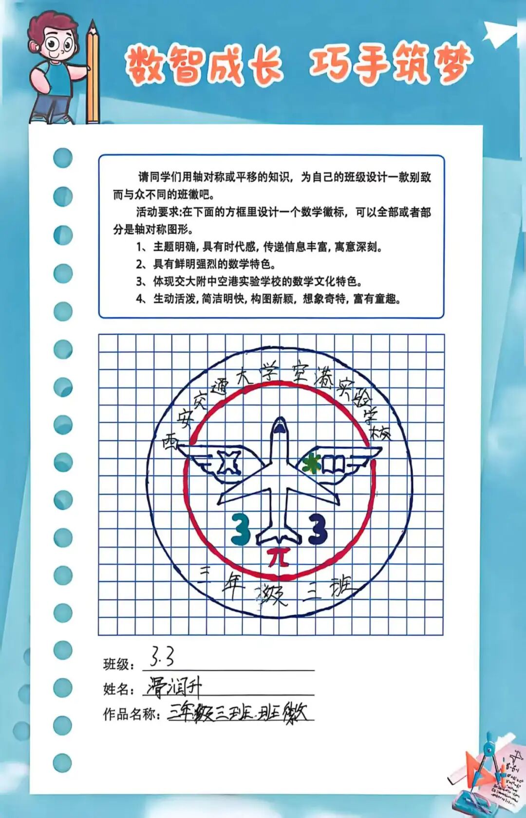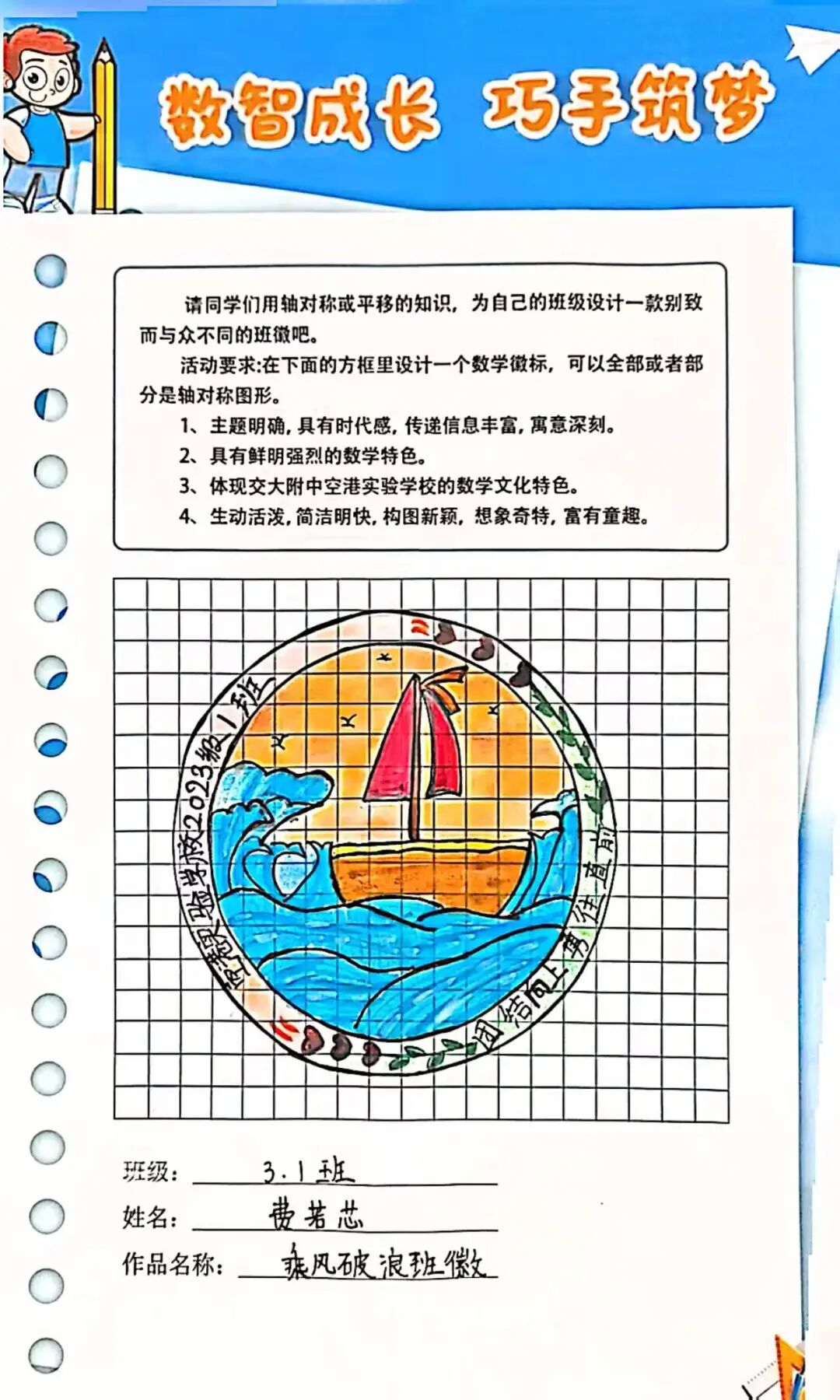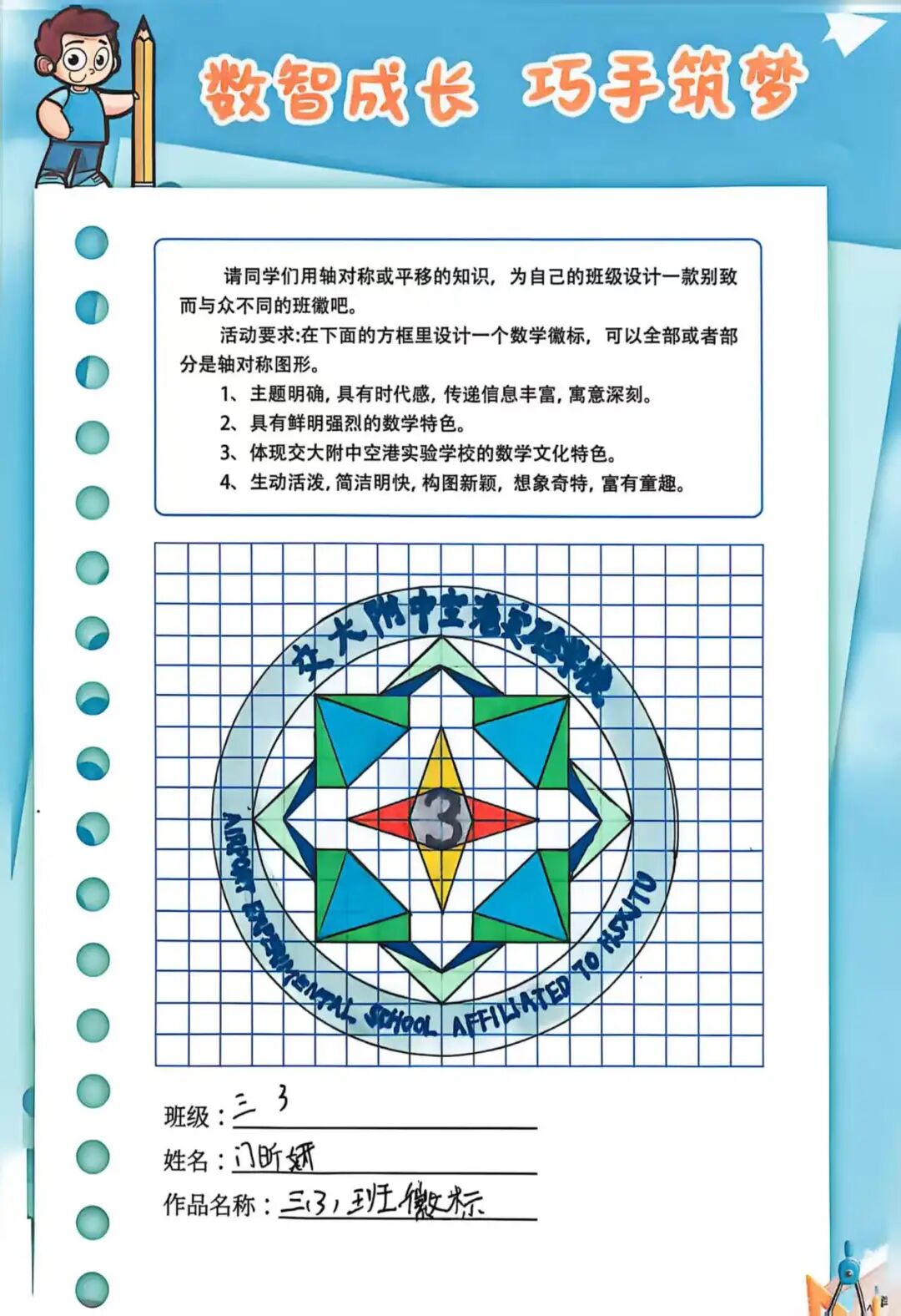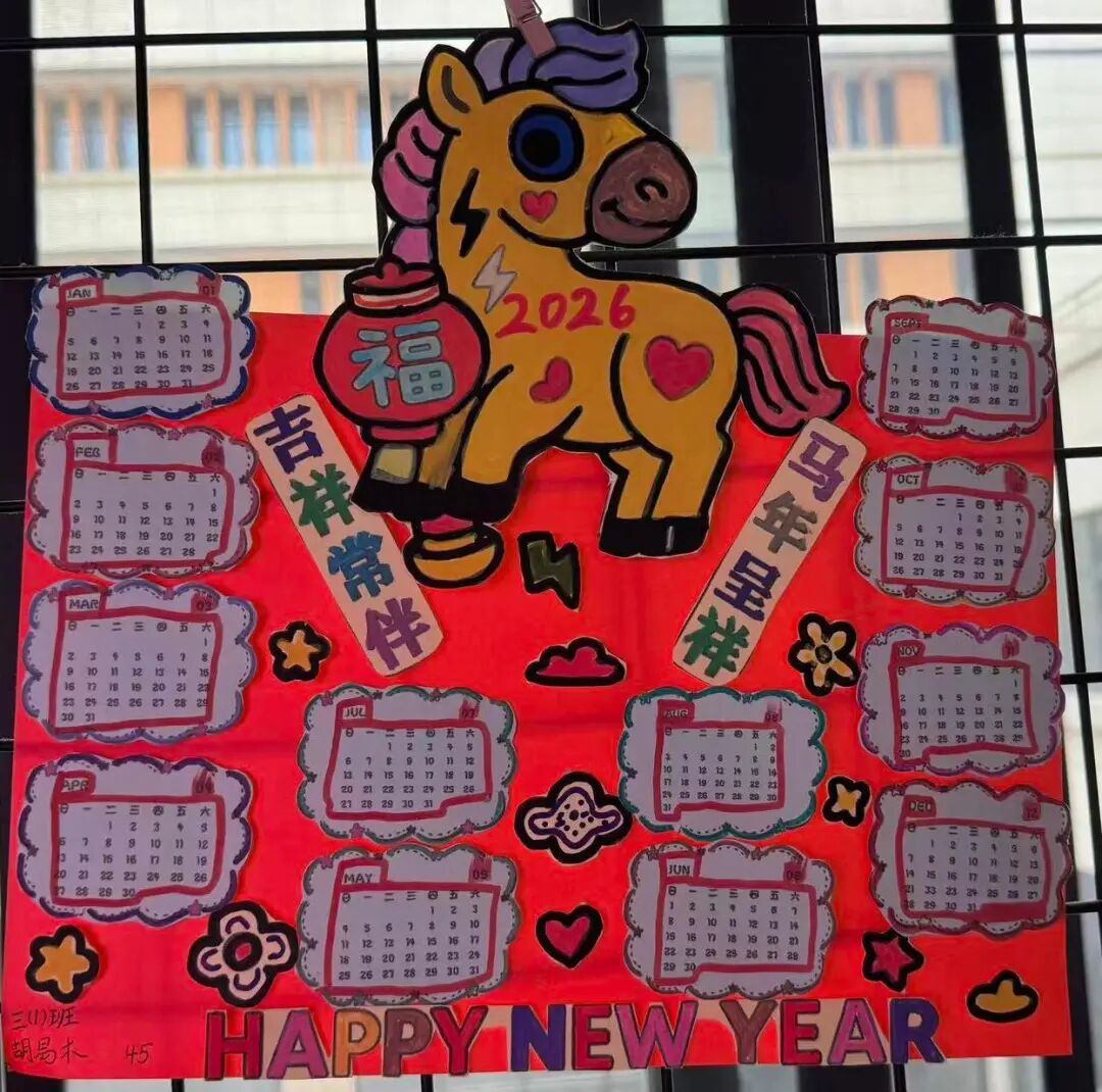 三年级孩子们聚焦“日历徽章·设计之美”,完成了2026年日历制作与班徽设计等任务。在日历制作中,孩子们梳理年月日的知识,锻炼测量统计能力;在班徽设计里,同学们融合数学图形与校园文化,发挥想象力与创造力,让设计之美与数学思维碰撞出精彩火花。