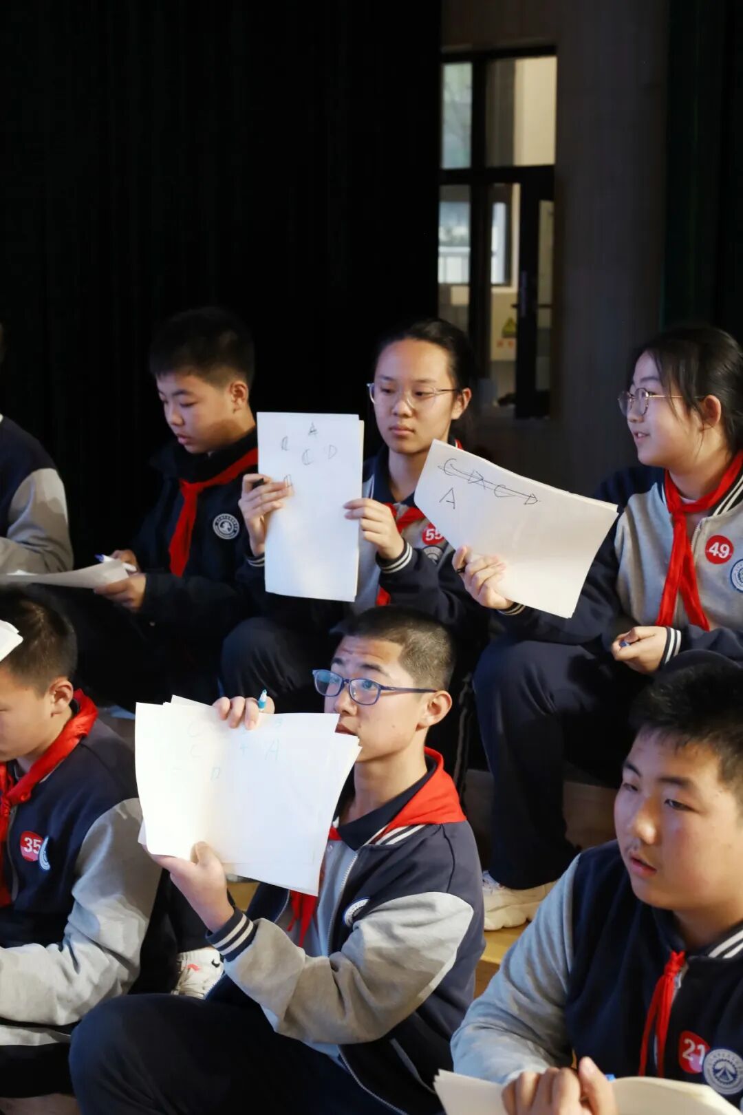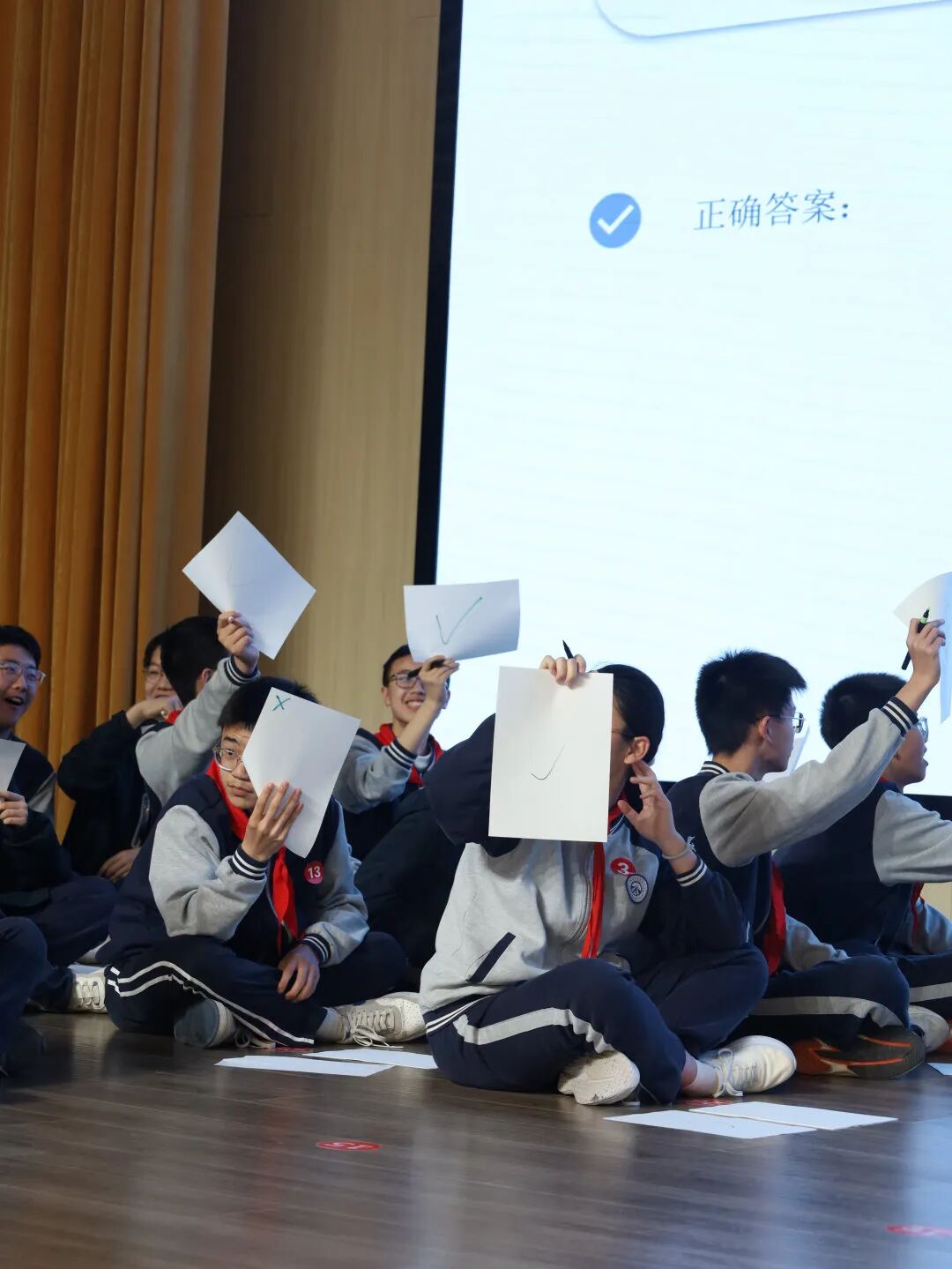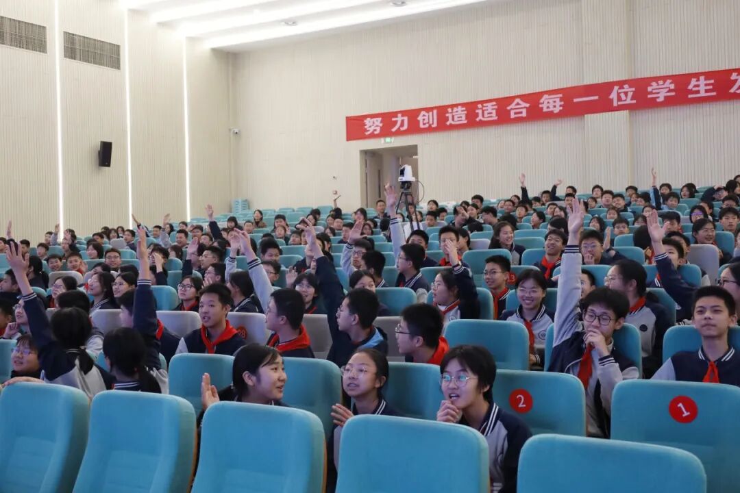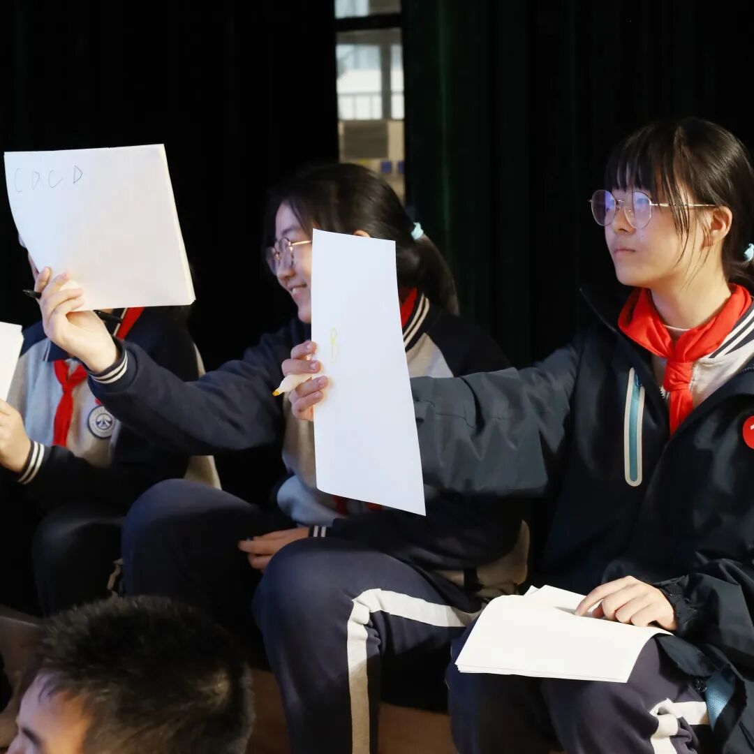 首轮比拼中,60位学子同台竞技。同学们目光坚定、自信满满,随着“答题时间到”的口令响起,大家迅速举起手中的答题纸。答对者欢呼雀跃,答错者虽遗憾离场,却也收获了掌声与鼓励。台下观众的热情助威,将现场气氛不断推向高潮。