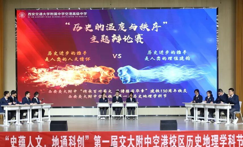 以思辨探历史脉络,以言辞论文明发展。4月10日,西安交大附中空港校区首届历史地理学科节迎来收官之战——历史辩论赛火热开赛,高一、高二学子围绕“历史进步的推手,是人类的人文情怀,还是理性建构”展开对决,为全场呈现了一场精彩的思想盛宴。
