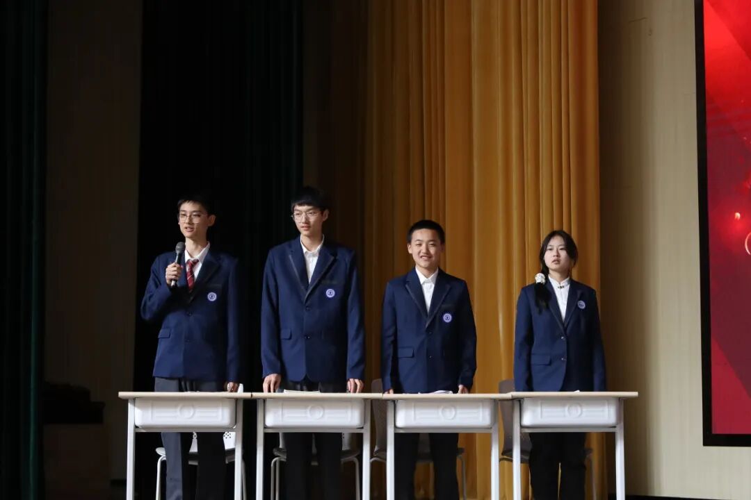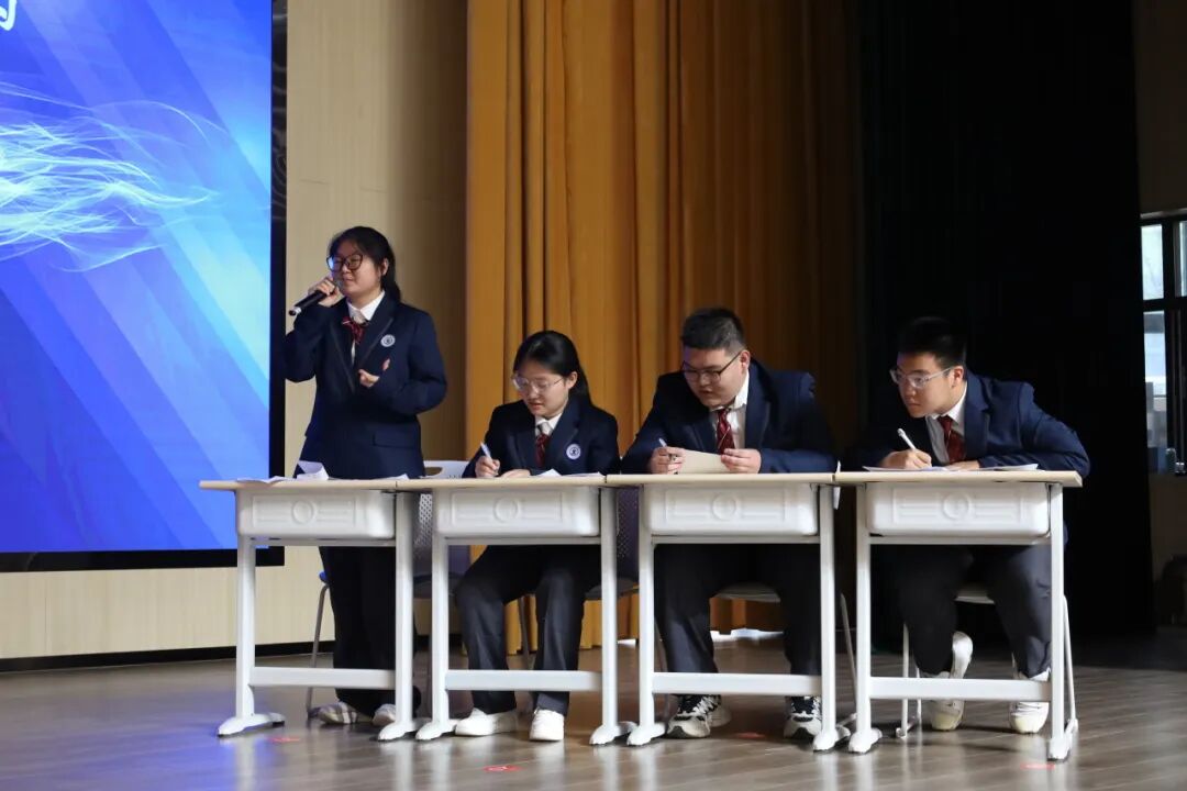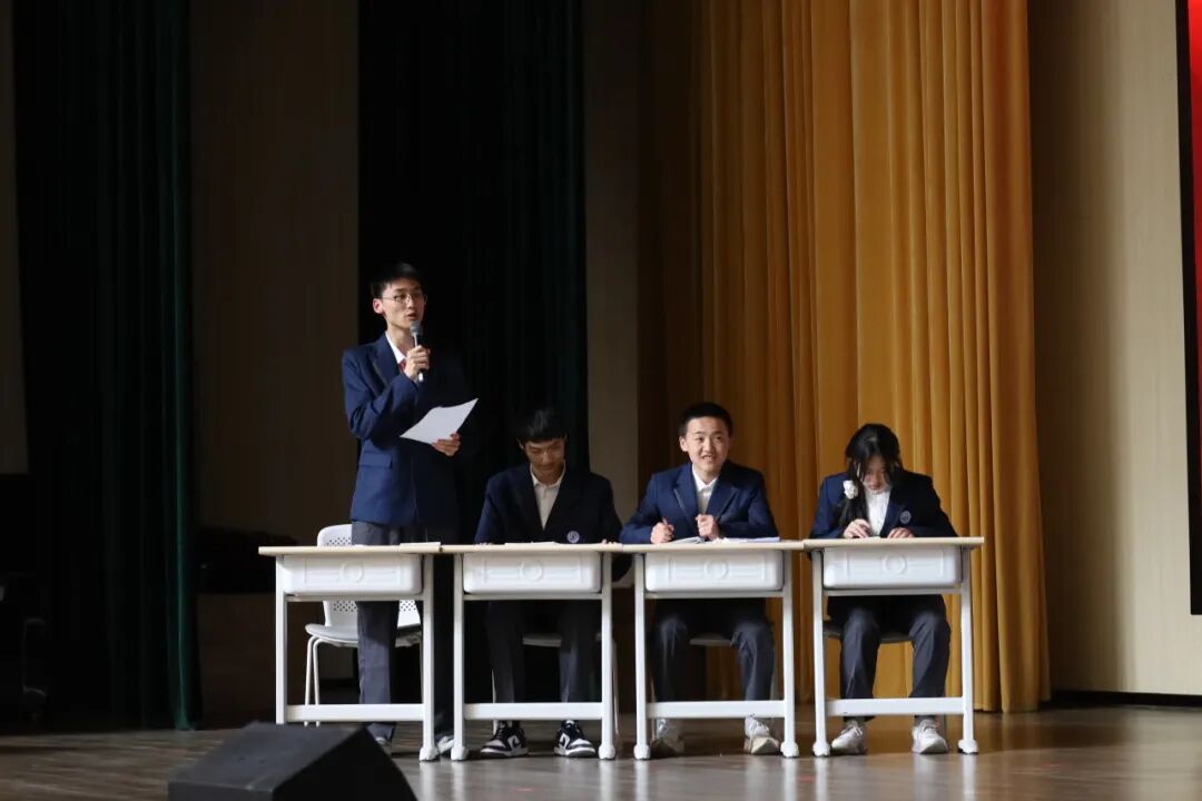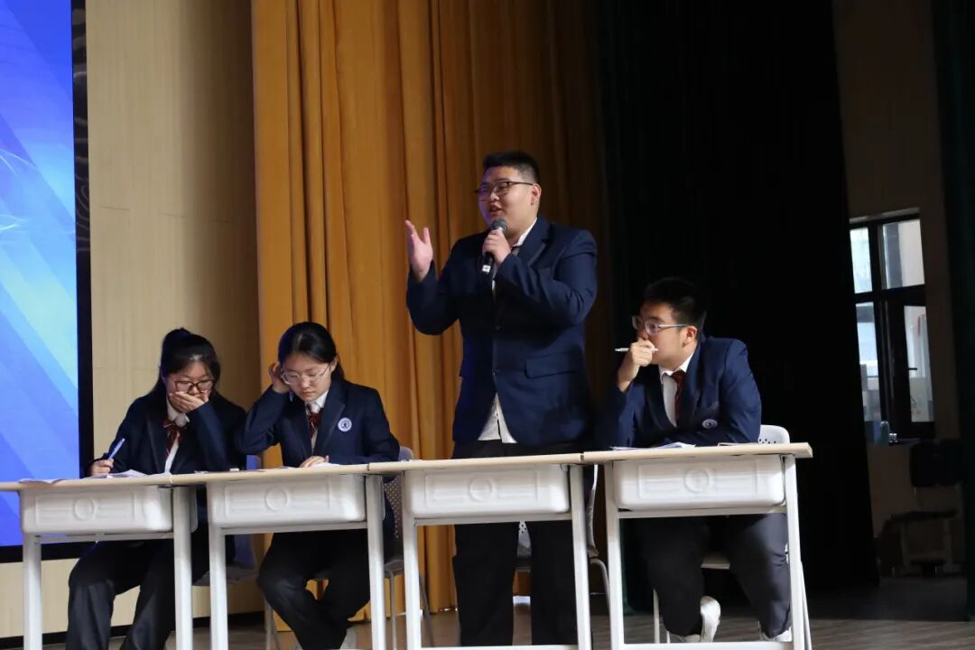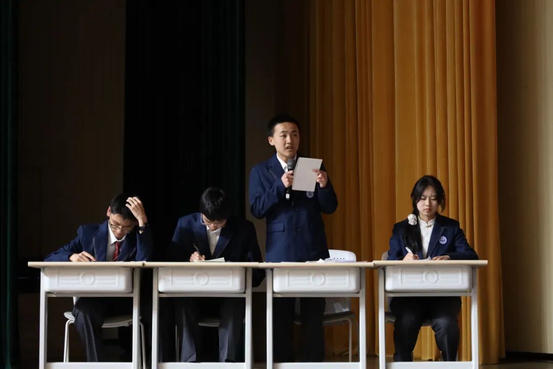 本次辩论赛以年级为单位展开智慧较量,高一年级代表队作为正方坚守“历史进步的推手是人类的人文情怀”立场,高二年级代表队作为反方力主“历史进步的推手是理性建构”观点。