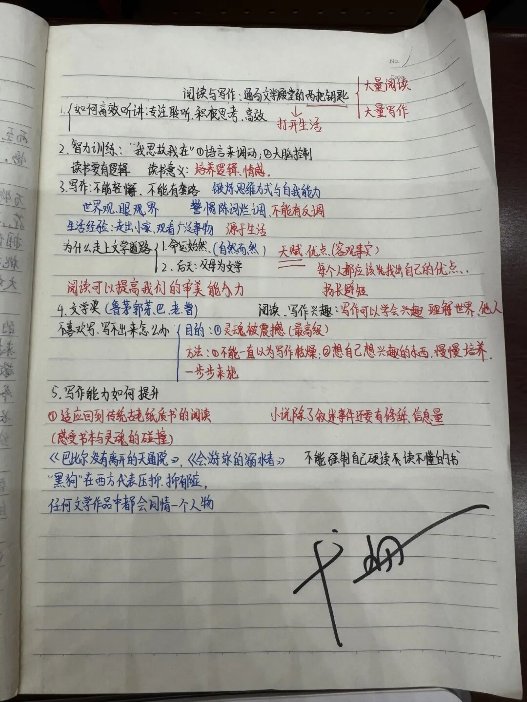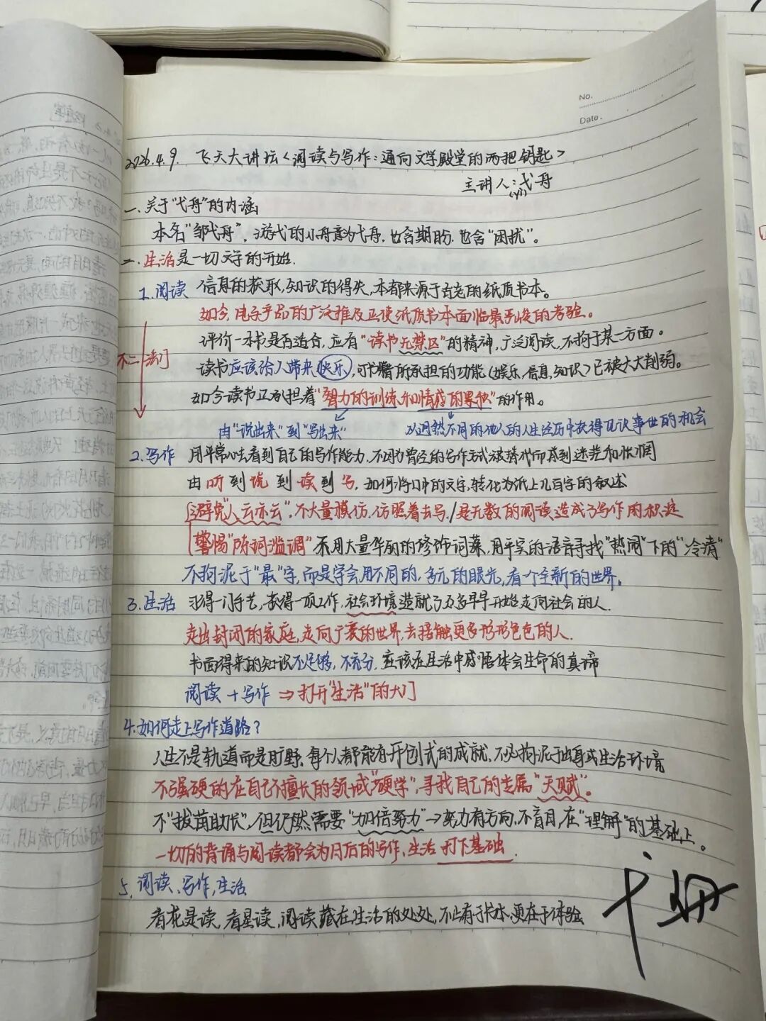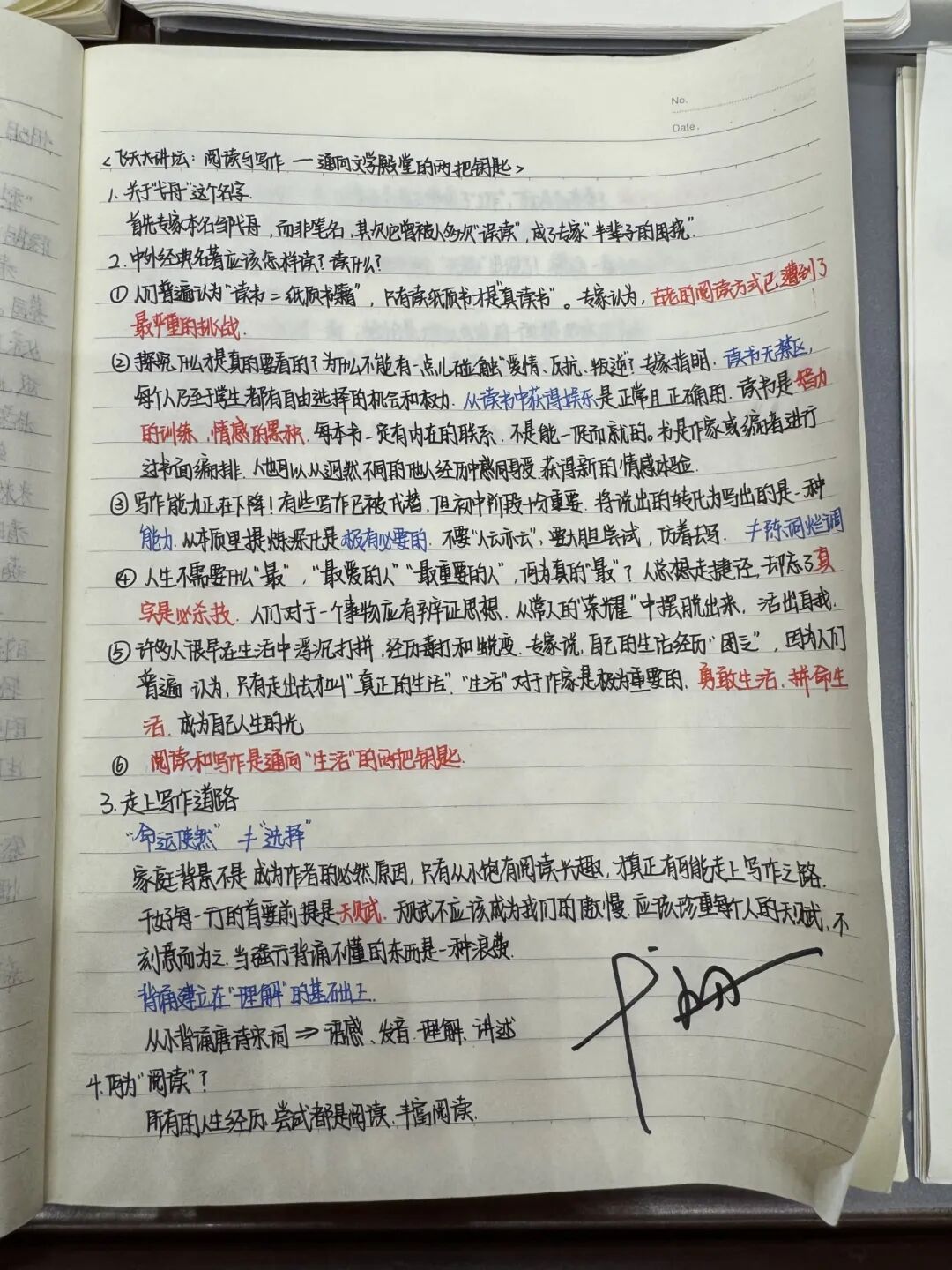 弋舟老师特意为认真记录、内容精彩的讲座笔记逐一签名。一笔一画,皆是温度;一字一句,满是期许。他将文学的力量、文字的温暖,亲手传递给每一位心怀热爱的航一学子。