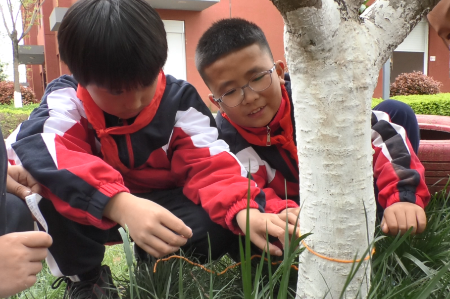 数学:低年级化身“图形收藏家”,在花坛、枝丫间寻找基础图形;中高年级走进桃园、石榴园,测量树叶与枝条,探究不规则图形的周长。