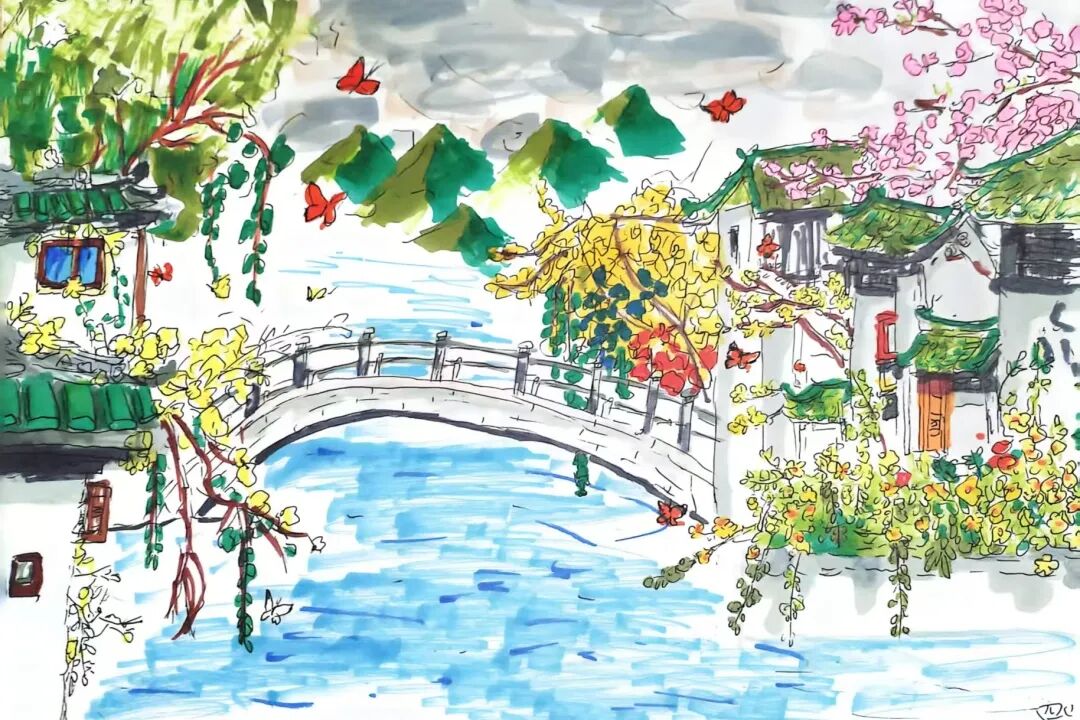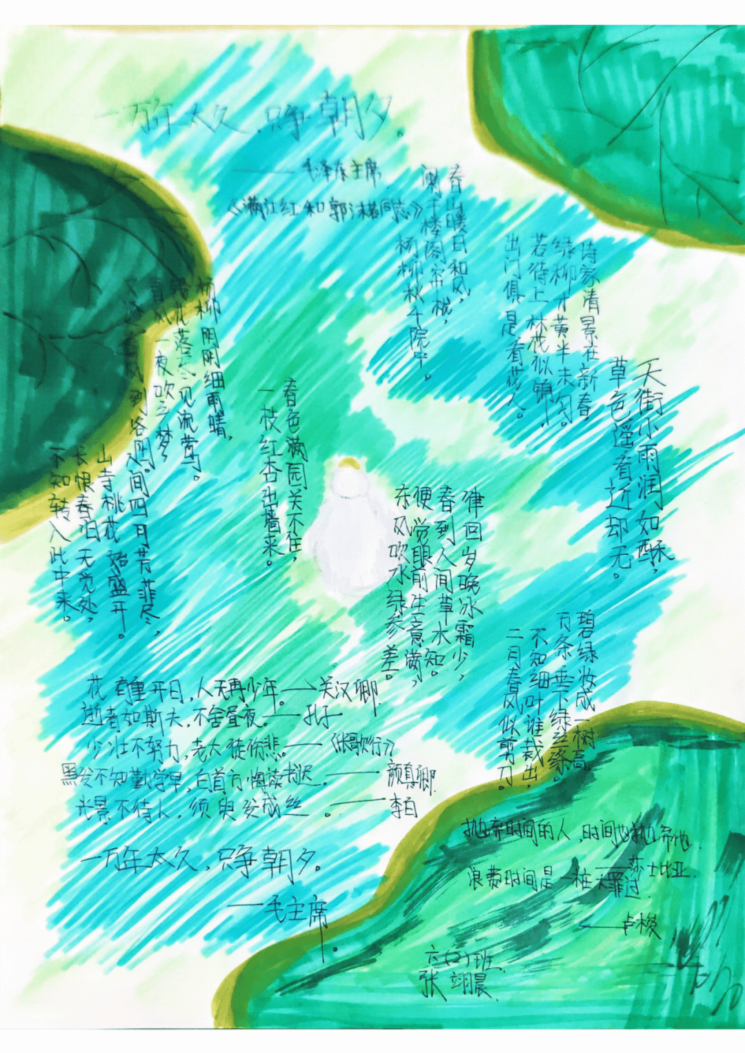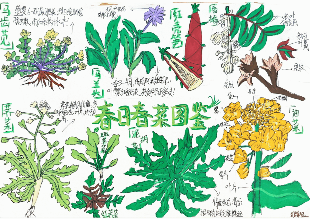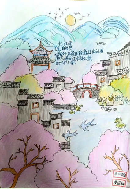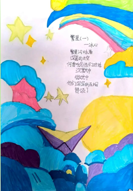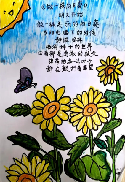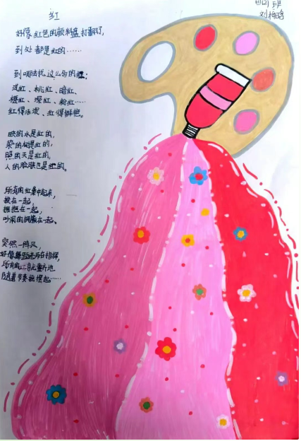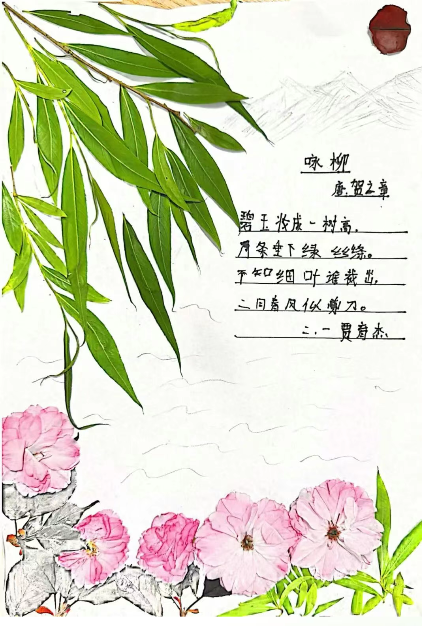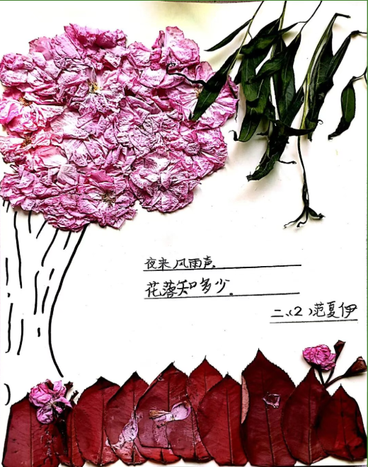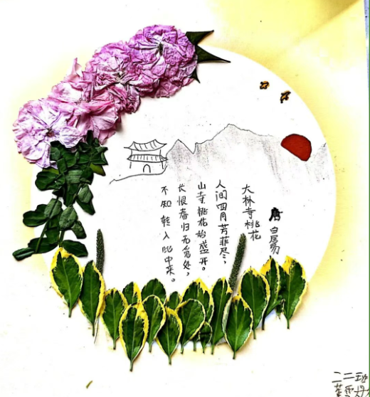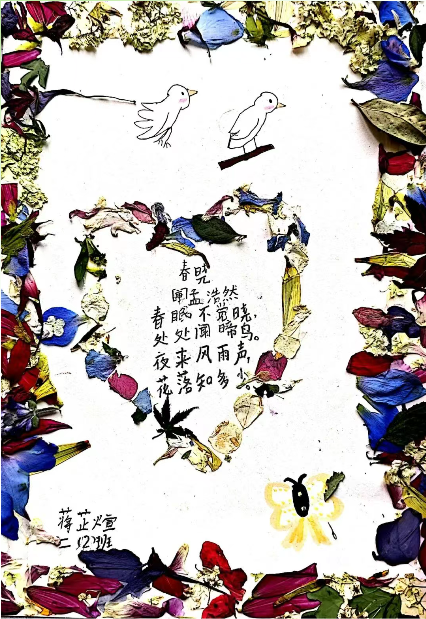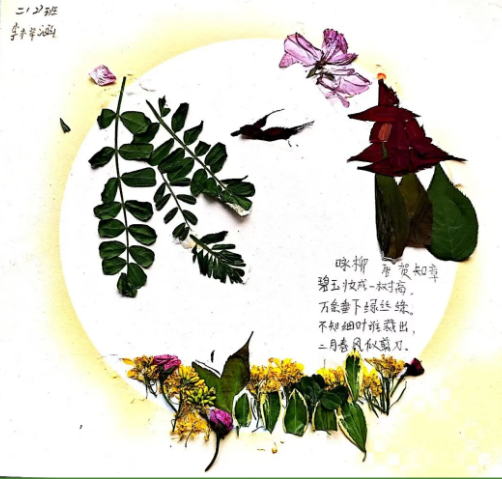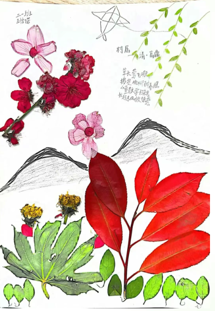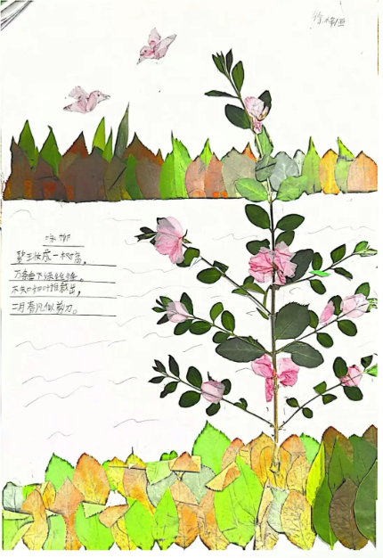 美术:以校园春日植物为素材,开展色彩拼贴、户外写生,并为原创诗歌设计配画与诗集版式。