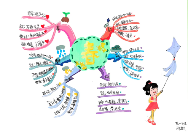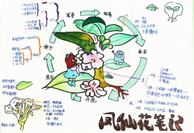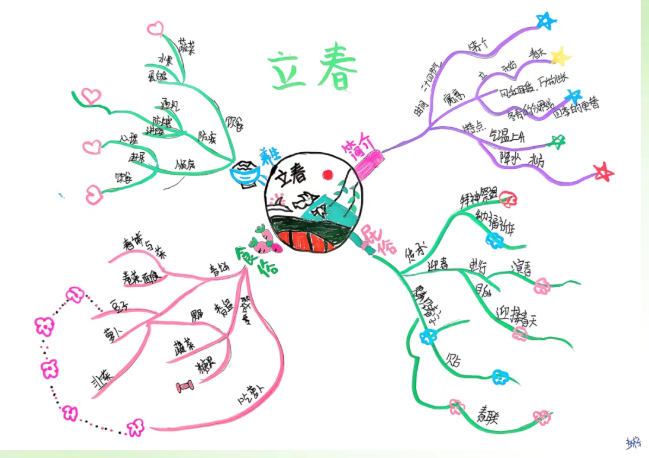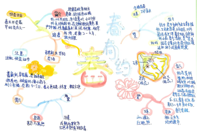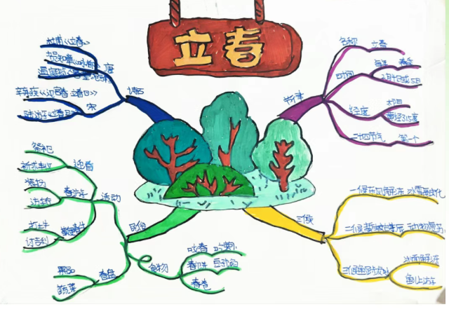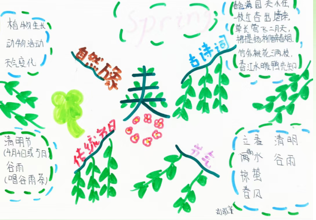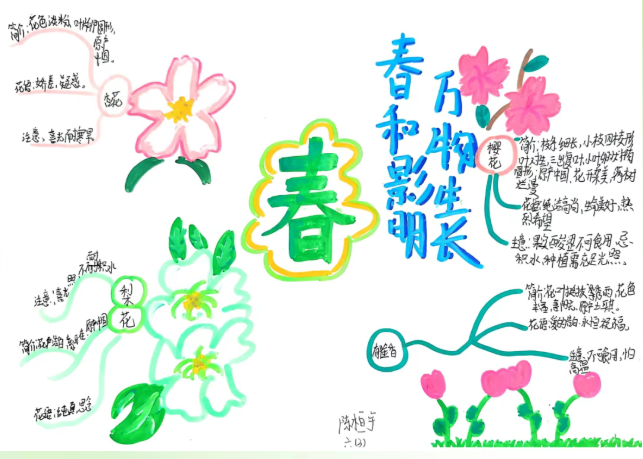 科学课聚焦校园春天里的植物与昆虫,记录它们的生长、活动特征;语文课则引入春日诗词与节气知识,帮助学生理解物候变化与节气的内在关联。学生以思维导图的形式,将观察记录、诗词积累、物候规律和节气知识系统梳理,呈现出一张张逻辑清晰、内容丰富的春日知识图谱。