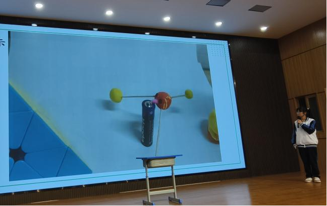 初二(1)班成可欣同学结合自制的人造卫星模型,讲解卫星工作原理及其广泛用途,让大家认识到浩瀚宇宙中人类用智慧创造的“点点星辰”,激发了同学们搏击太空的梦想。