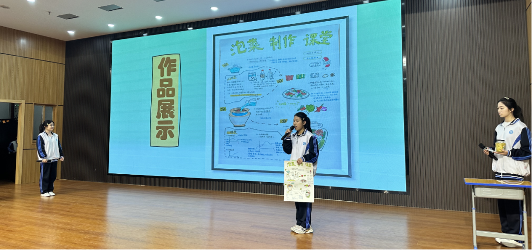 高二(3)班张欣蕾、敬钰婷、魏晨璐三位同学分享了制作泡菜的技术及其中蕴含的科学智慧,并用图文并茂的手抄报记录了泡菜转化过程中的生物、化学变化规律。