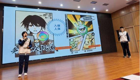 高二(1)班赵睿冰、闫浩琛、李张扬三位同学通过动漫展示免疫细胞的病毒攻防大战,揭示人体免疫系统工作原理,展现生命的智慧和顽强。