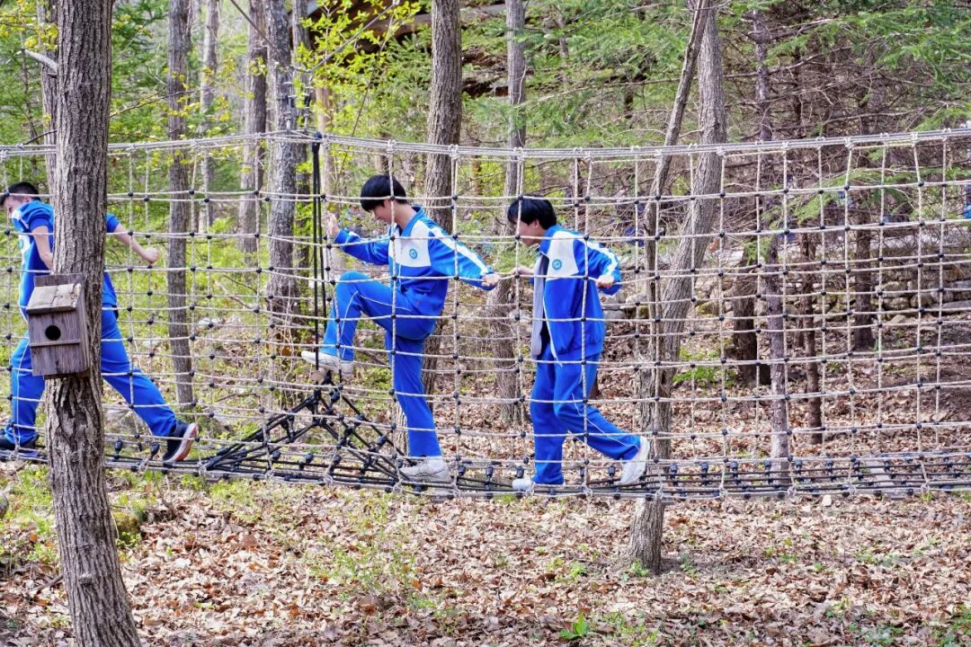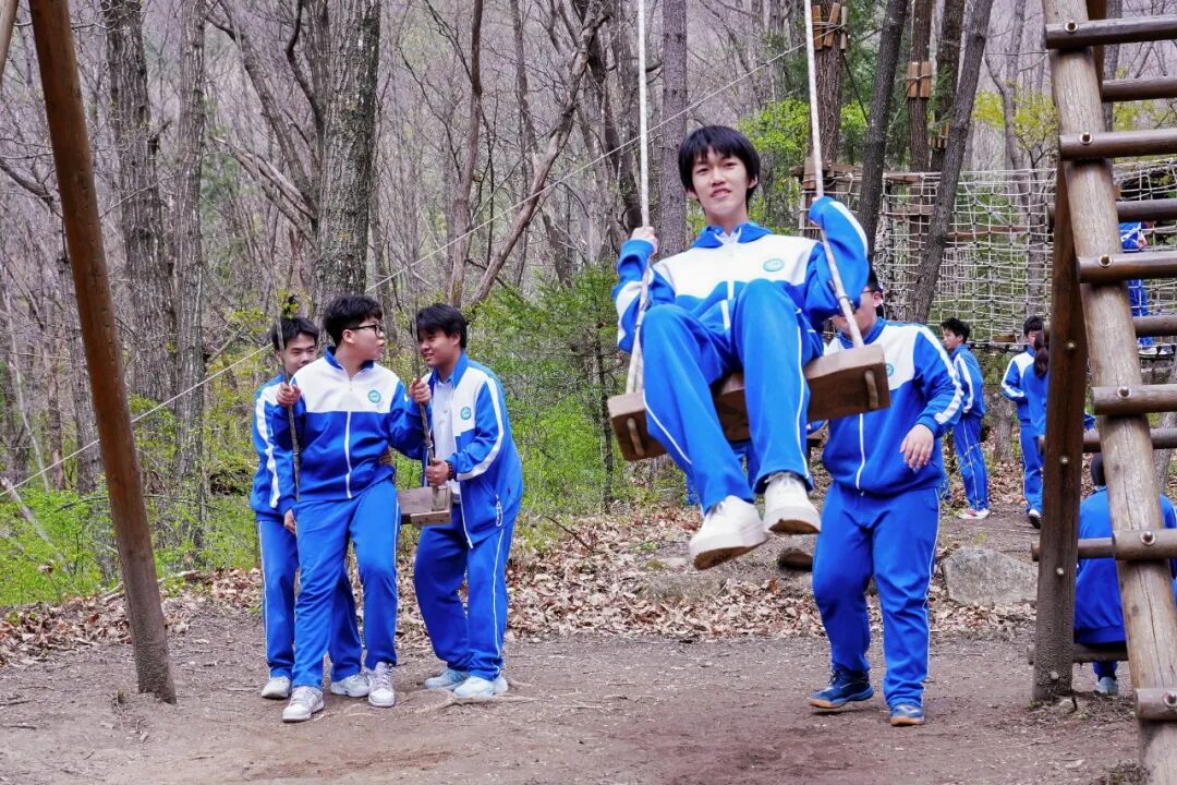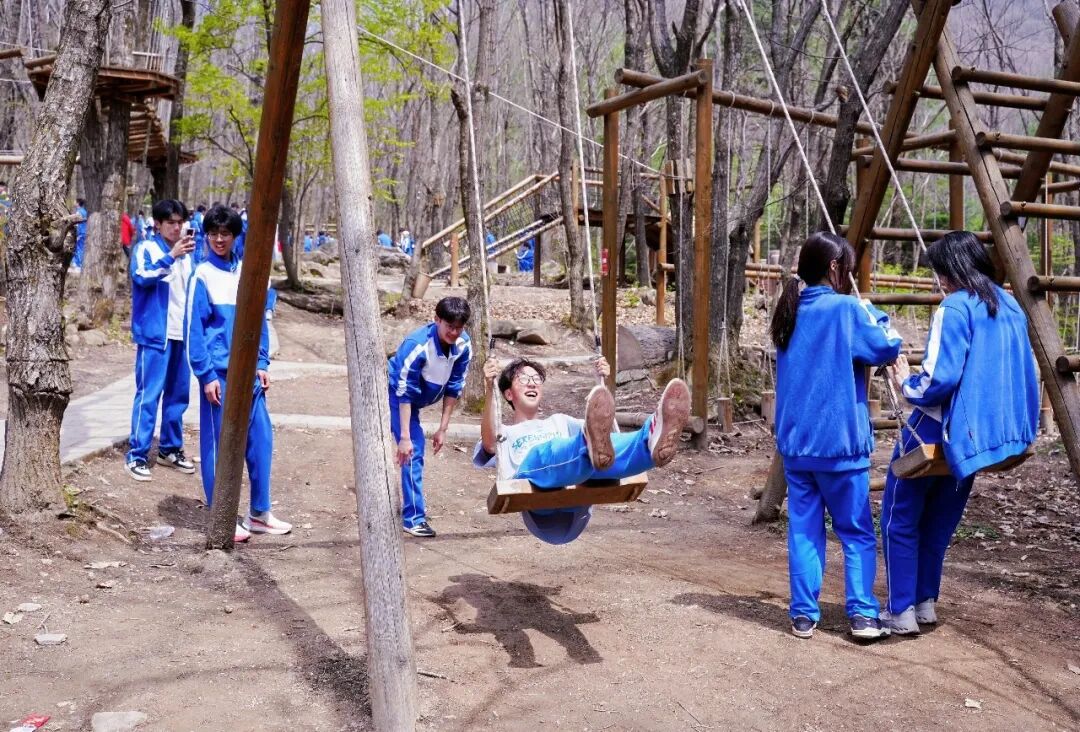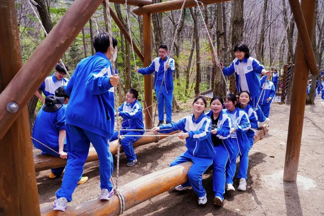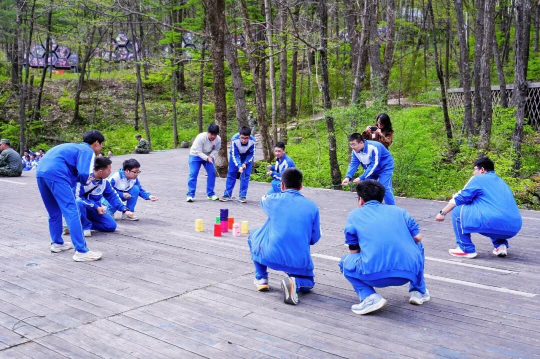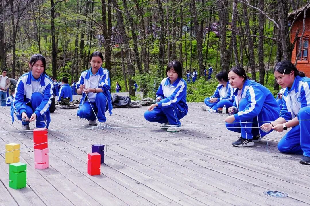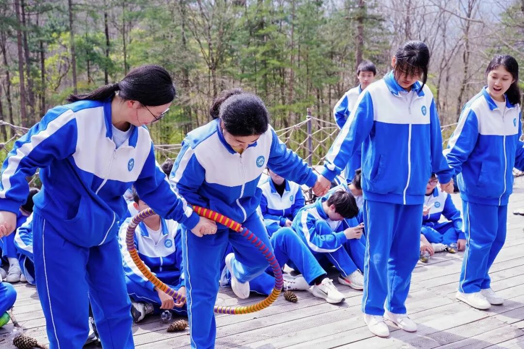 攀登的疲惫,在随后的团队拓展环节中被一扫而空。在开阔场地上,同学们以班级为单位展开了趣味闯关。