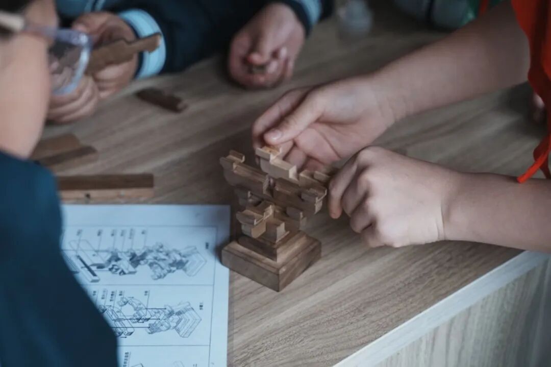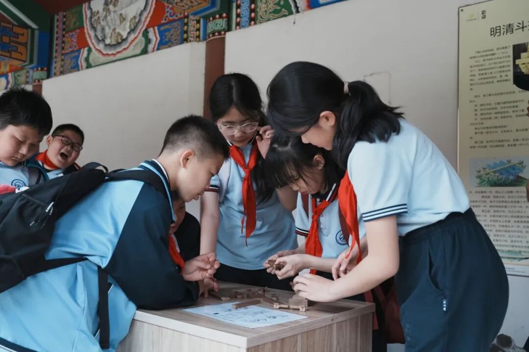 斗拱搭建现场,同学们分组合作,认真聆听老师讲解斗拱的结构原理与搭建技巧,小心翼翼地拼接每一个部件,从识别零件、调整角度,到精准拼接、稳固成型,大家互帮互助、耐心尝试,在一次次调整中,感受着传统建筑工艺的精妙与古人的智慧。