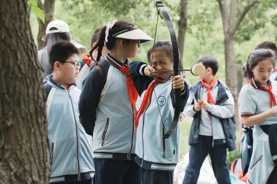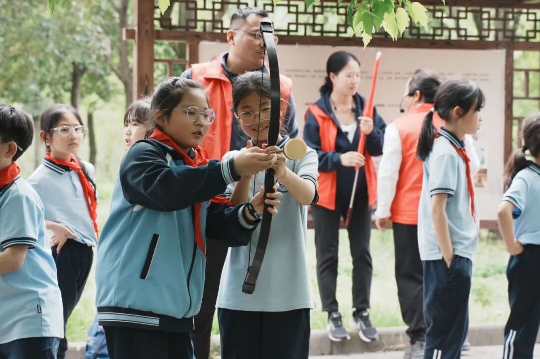 射箭体验区,同学们在老师的指导下,学习射箭礼仪,调整站姿、拉弓、瞄准、发射。